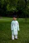Our Naariyal Baageecha Kurta Set is crafted for little celebrations that call for comfort with a touch of charm. With a smart placket detail finished with a single button in contrast pink thread, this set is playful in detail. Made in 100% handwoven Chanderi, it keeps your child at ease all day while carrying the grace of a festive outfit.