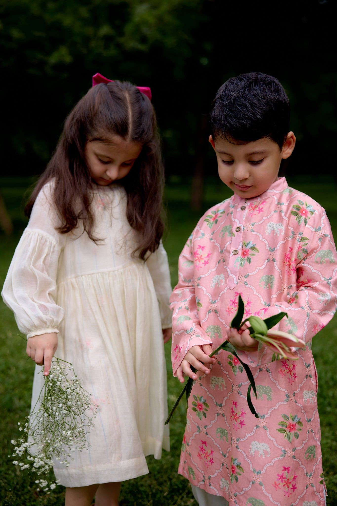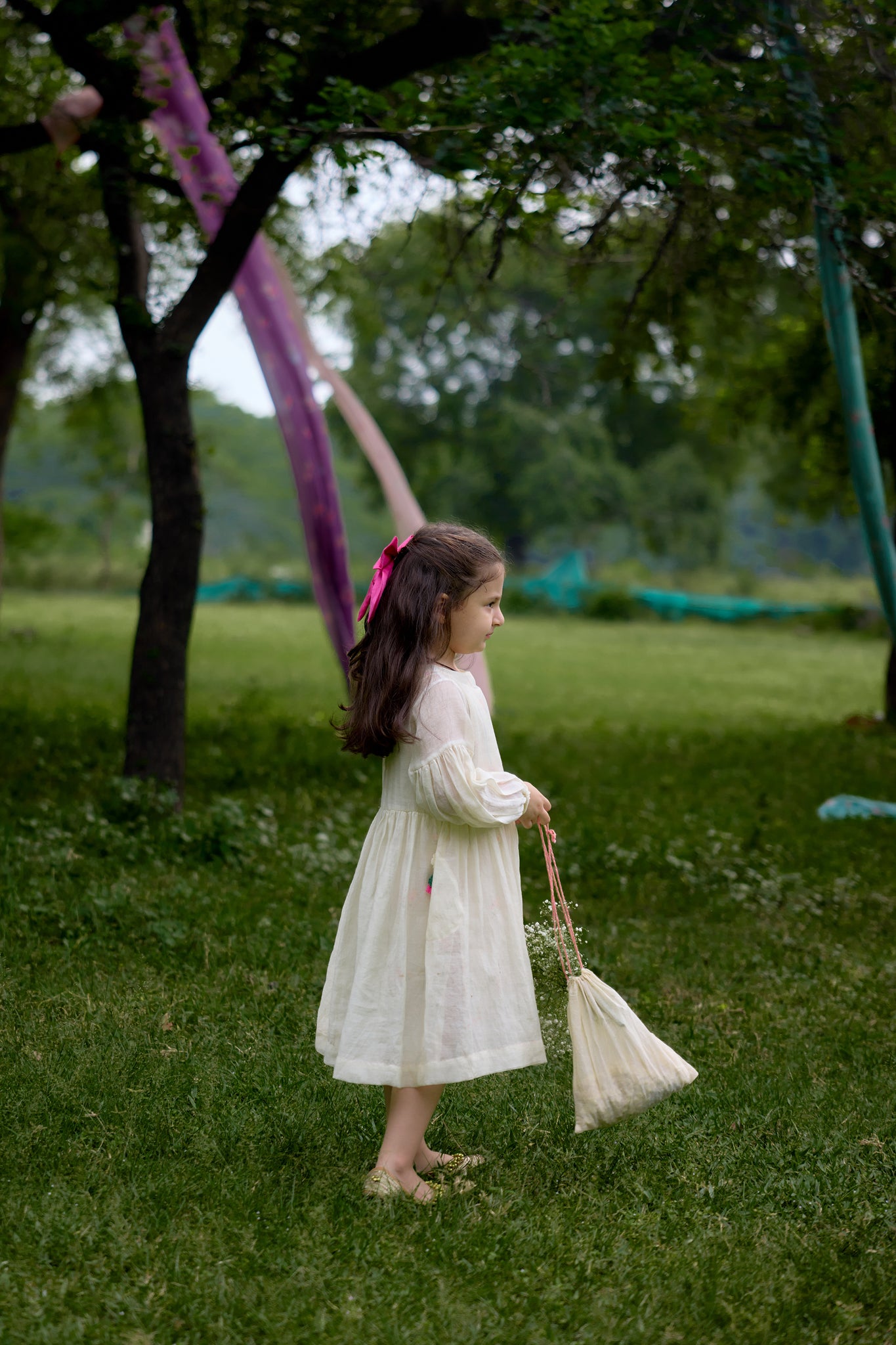 The Naariyal Phool Dress is crafted in soft off-white Mul Chanderi, layered with a slip in our Naariyal Rekh Chitthi print. This two-layered silhouette brings lightness and charm to your child’s festive wardrobe. Bright pink stitch details, a delicate flower-shell button, and a crochet flower tassel add playful accents, making the outfit glow with joy and celebration.