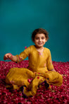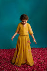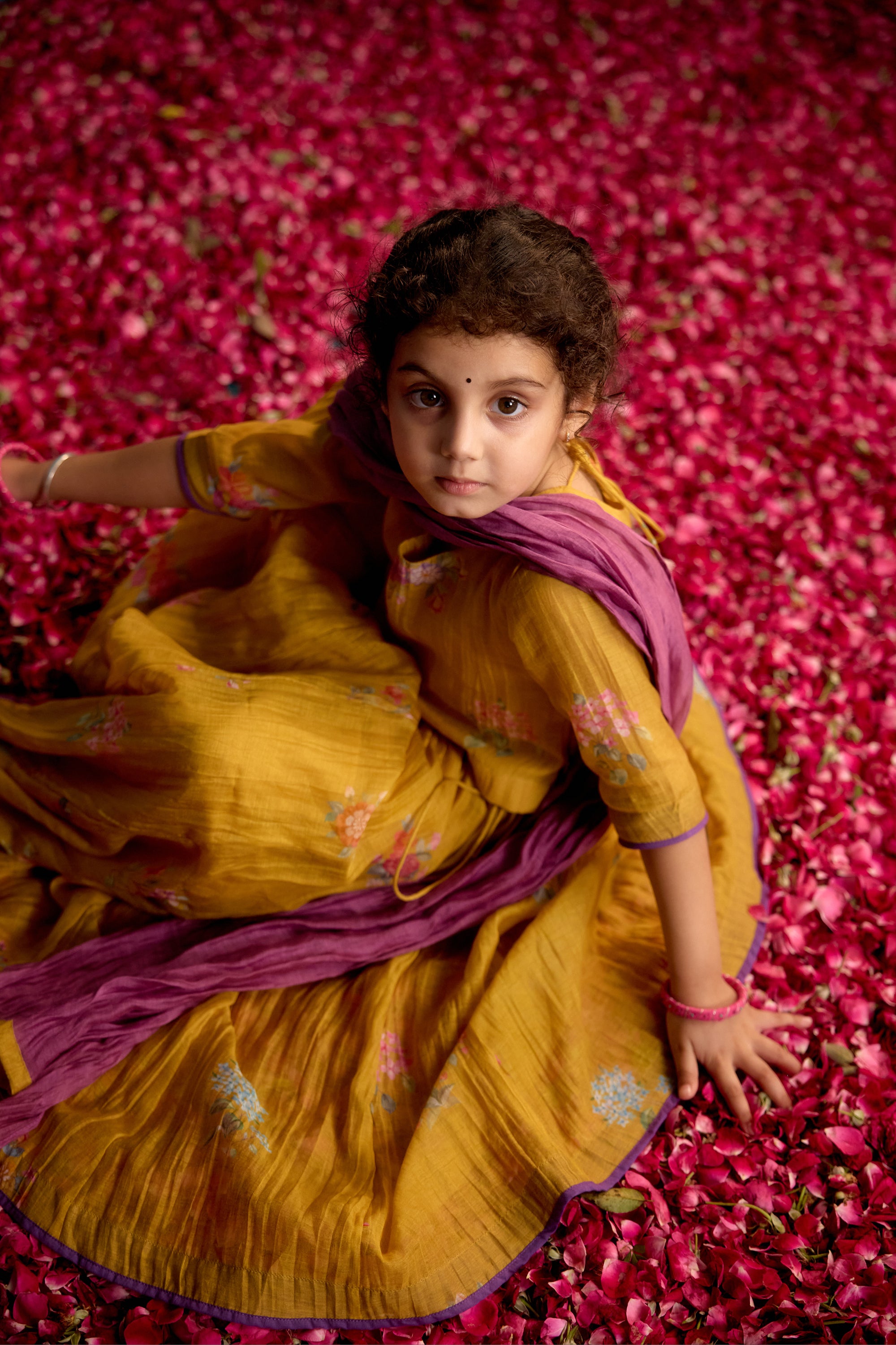 Our Neembu Chitthi Lehanga Set brings the brightness into festive moments. Paired with a matching choli adorned with handwork accents, this set can be paired separately with a contrasting jaamun dupatta, bordered in neembu for that joyful festive balance. Finished with little tassels that swing with every step, this ensemble is made for children to feel both special and comfortable during celebrations.