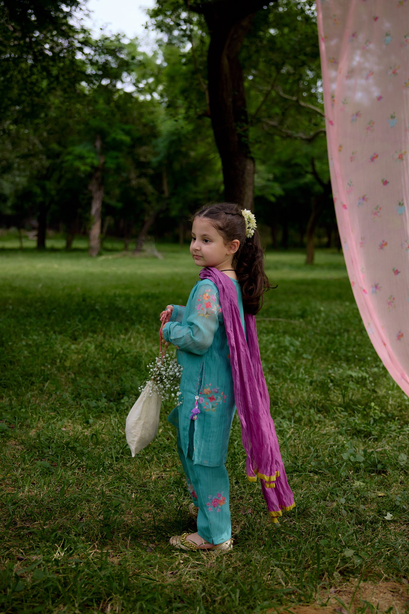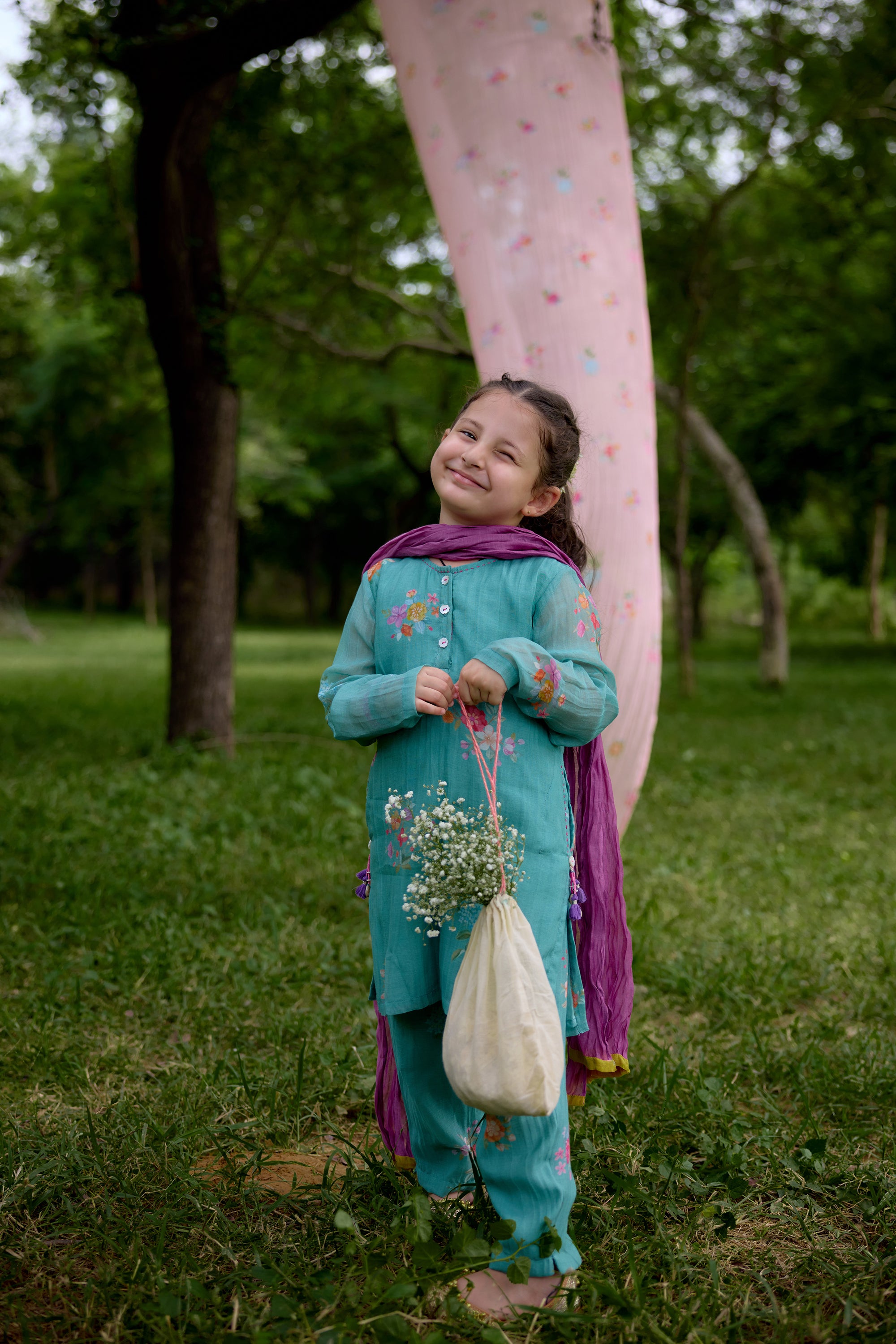 The Paan Chitthi Kurta Set is for the comfort with a festive spirit. The straight kurta in our Paan Chitthi print features playful details of running stitch and a tassel at the pocket, making it your child’s favourite. It pairs with matching straight pants in Paan Chitthi for a coordinated look. The set comes with a Jaamun dupatta, finished with a Paan border for that extra bit of festive charm.