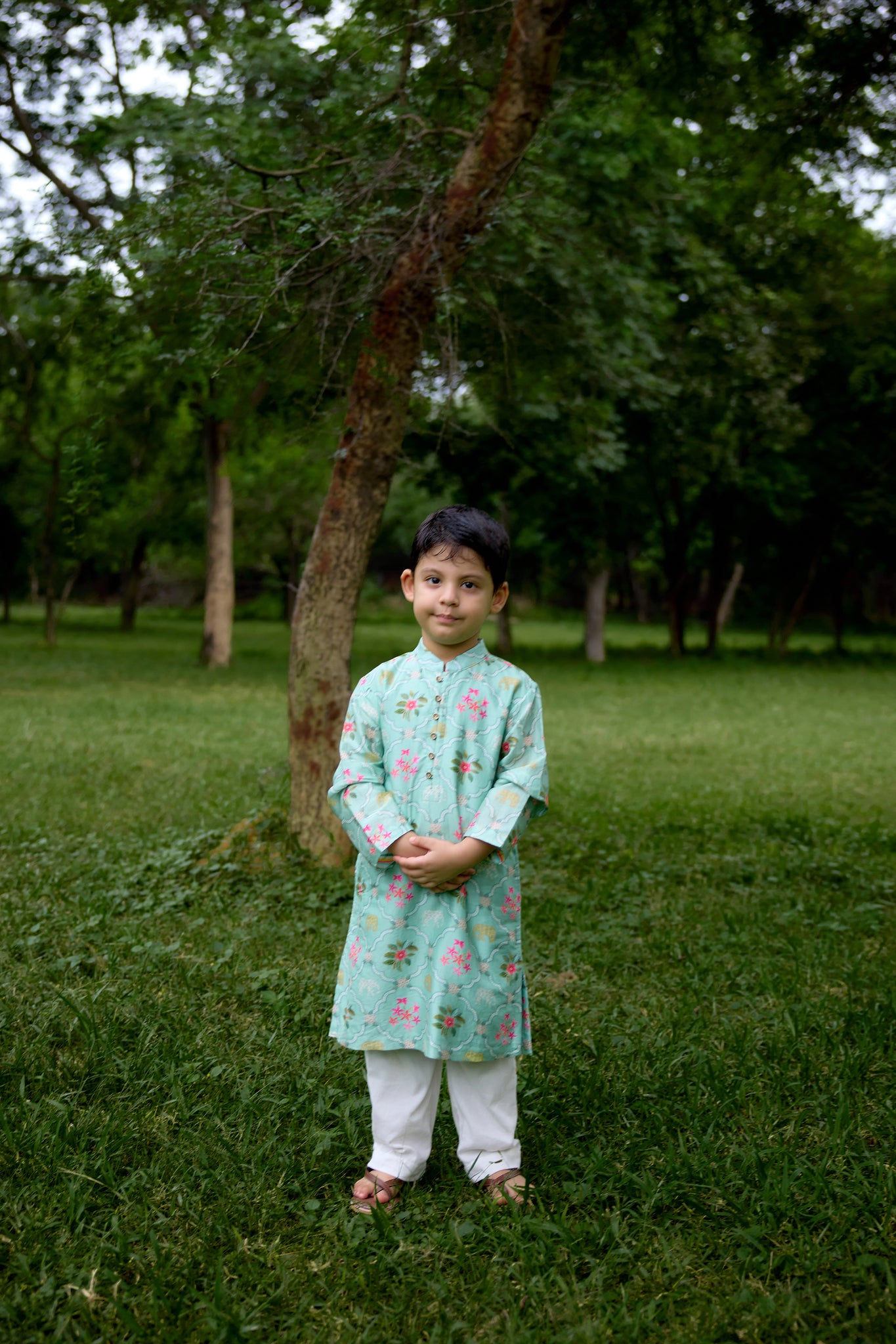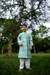 Our Vayu Verandah Kurta Set is crafted for little celebrations that call for comfort with a touch of charm. With a smart placket detail finished with a single button in contrast pink thread, this set is playful in detail. Made in 100% handwoven Chanderi, it keeps your child at ease all day while carrying the grace of a festive outfit.