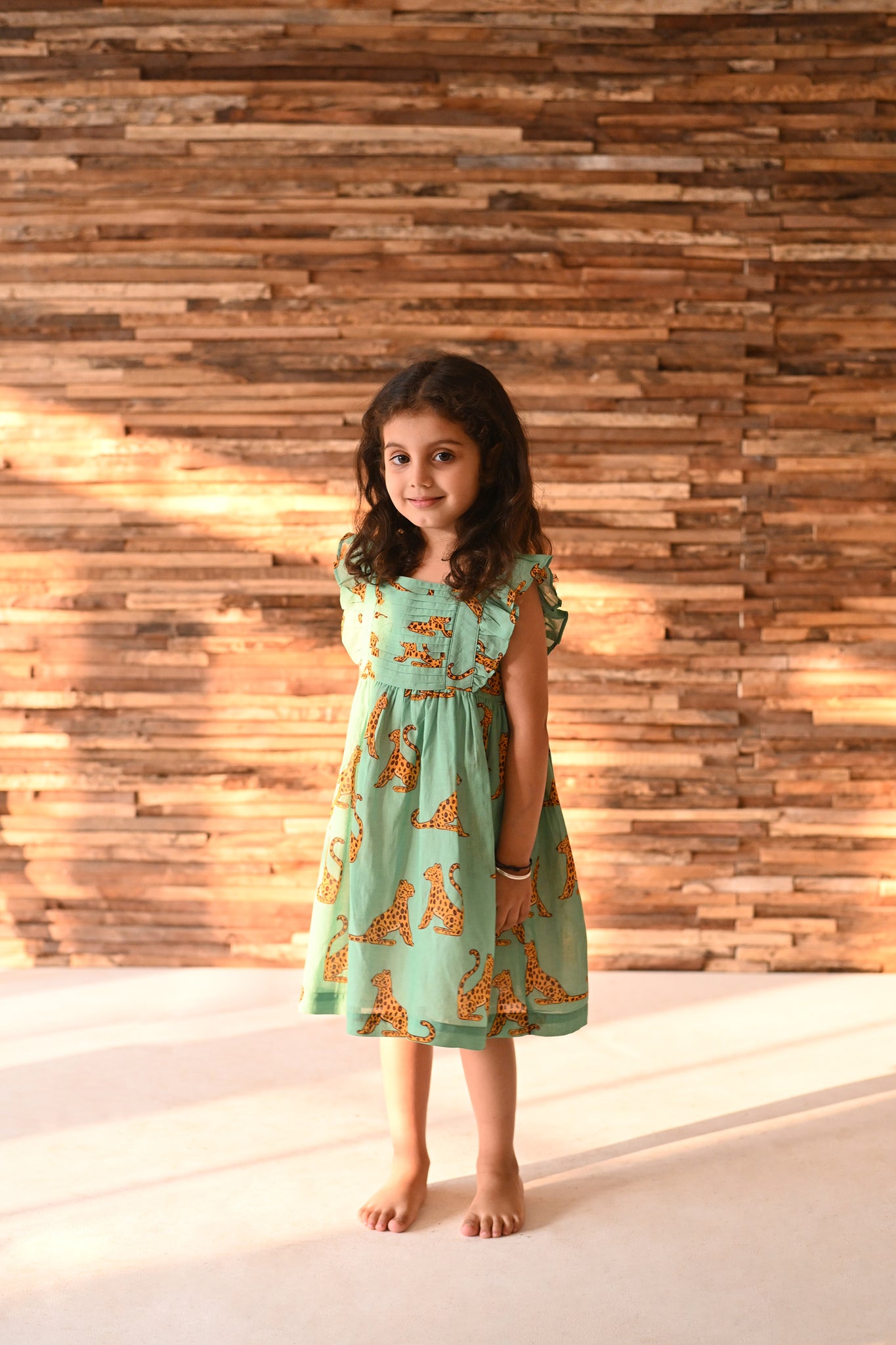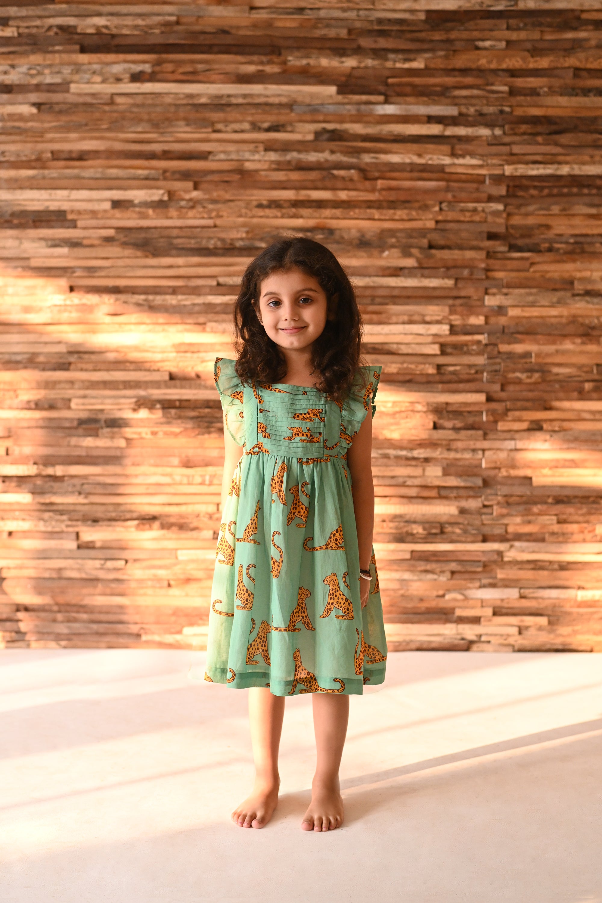 This dress showcases fine pleating along the bodice, framed by embroidered ruffle sleeves. The vibrant leo print adds a playful charm, perfectly balanced by the structured, gathered silhouette, named after the leopards of Londolozi.