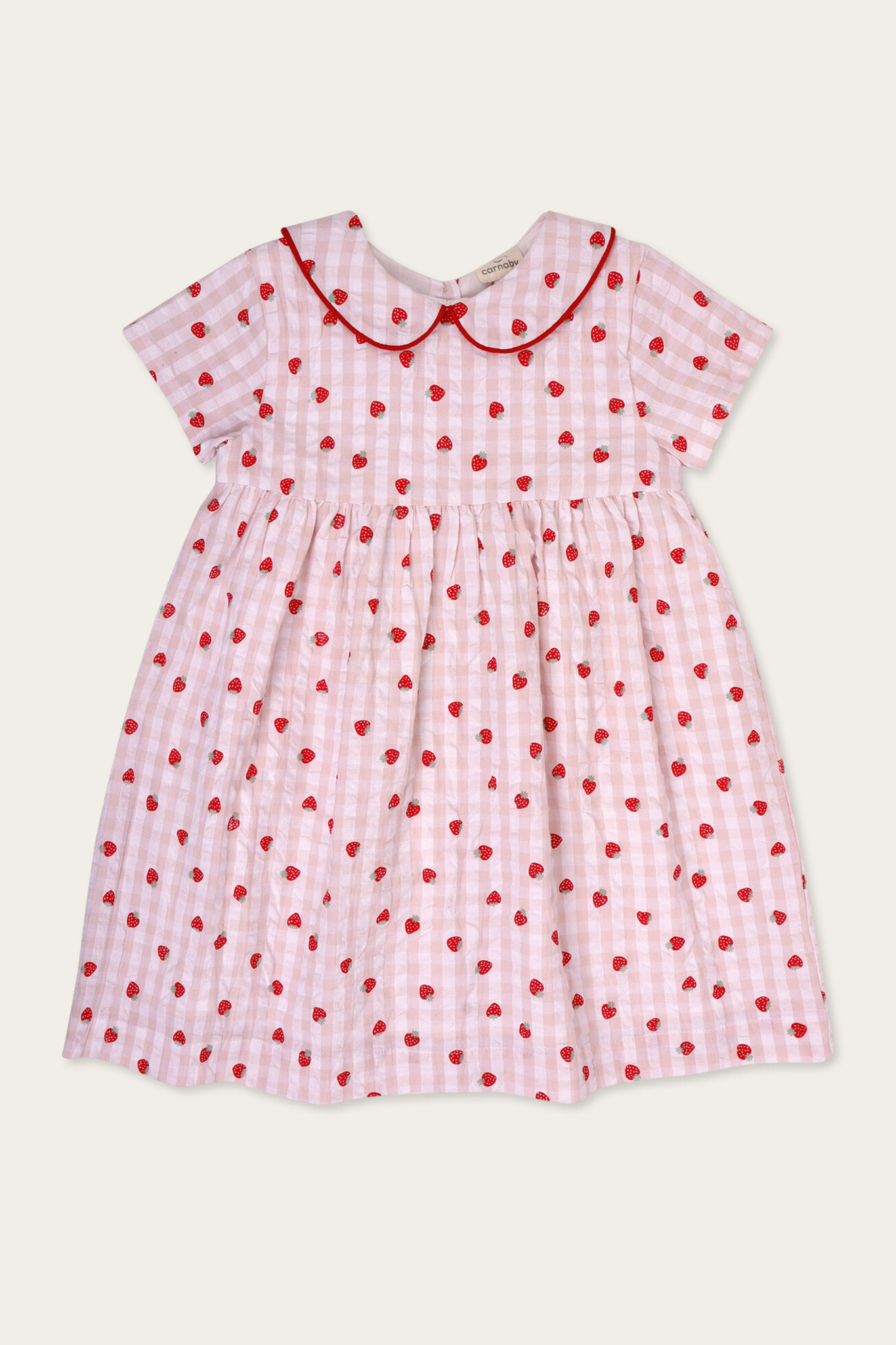 An embroidered Peter Pan collar highlights this dress, complemented by delicate print. The soft, flowing structure ensures ease and comfort.
