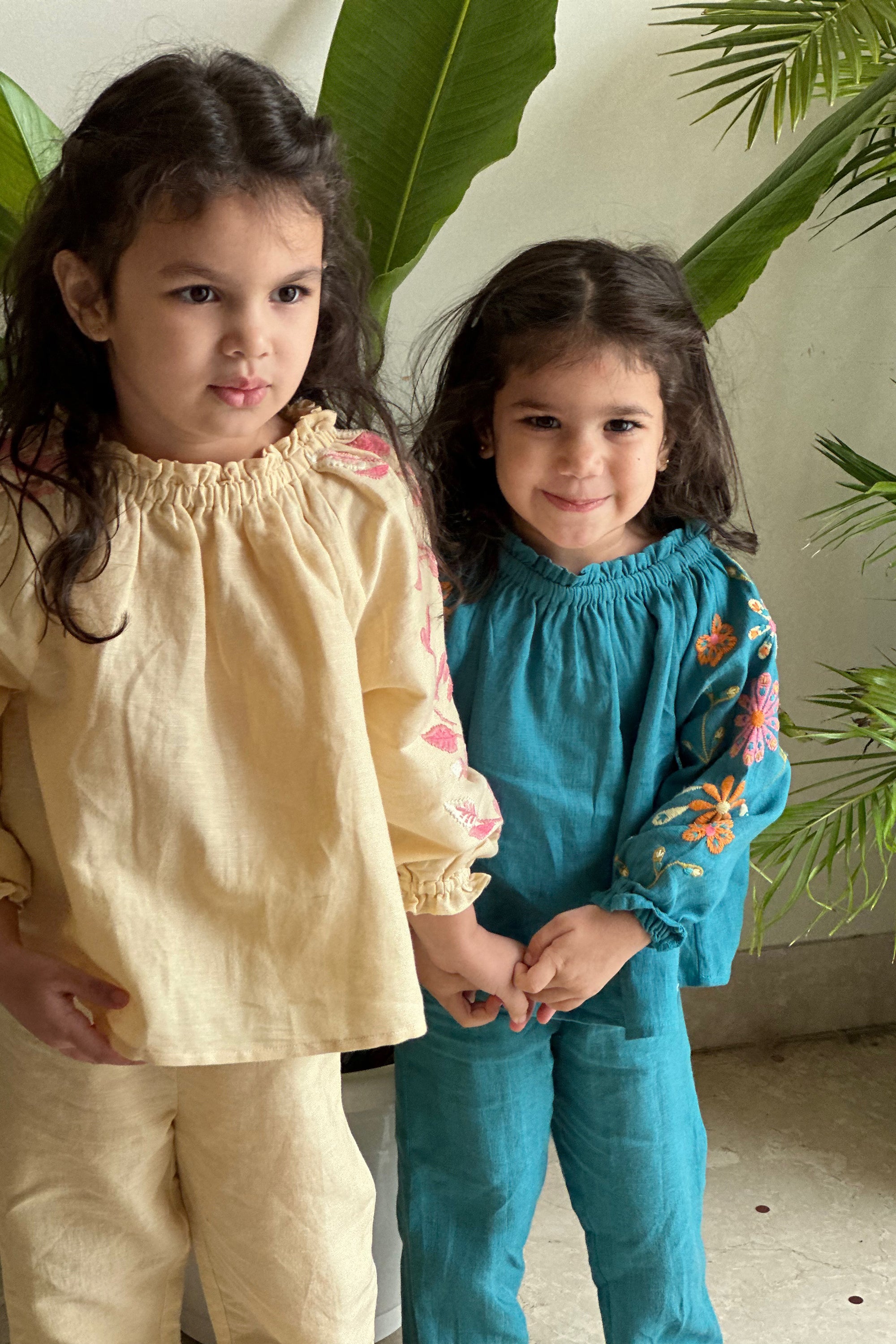 A two-piece set featuring a softly gathered top with an elasticated neckline and wide sleeves detailed with floral embroidery. The top falls gently with a loose, airy shape. Paired with straight-cut bottoms designed with a comfortable waist and a clean, unfussy finish, allowing ease of movement while keeping the silhouette balanced.