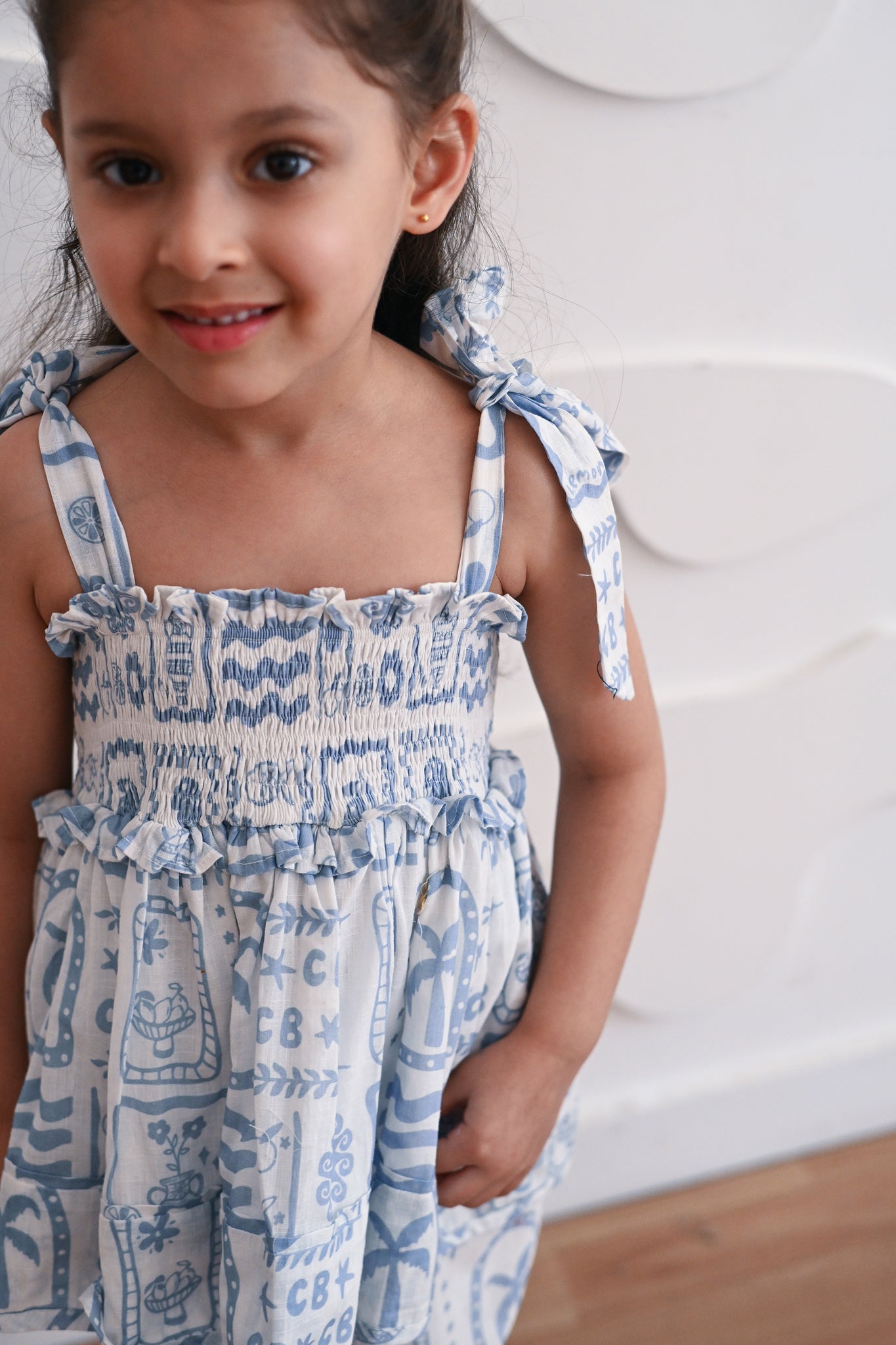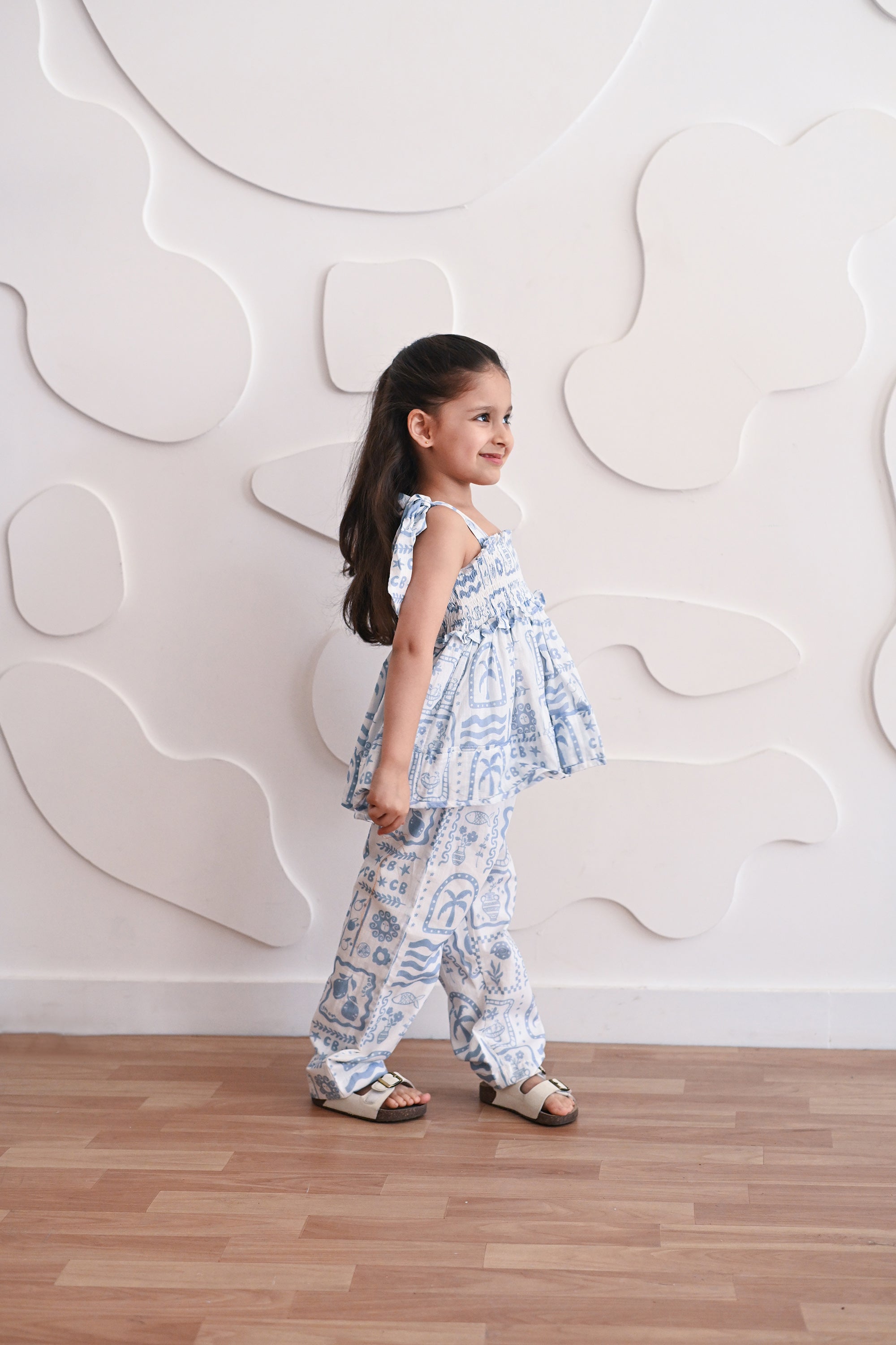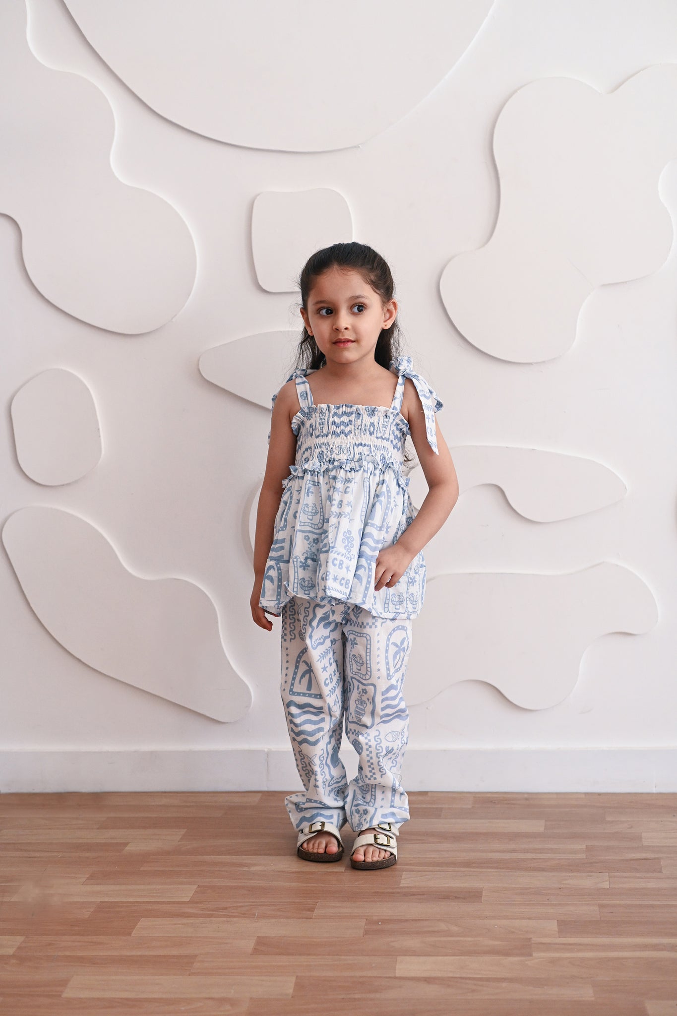 This set pairs a smocked top with tie-up straps and straight-cut pants. The hand drawn motifs make it a striking choice for an effortless fit in the summer