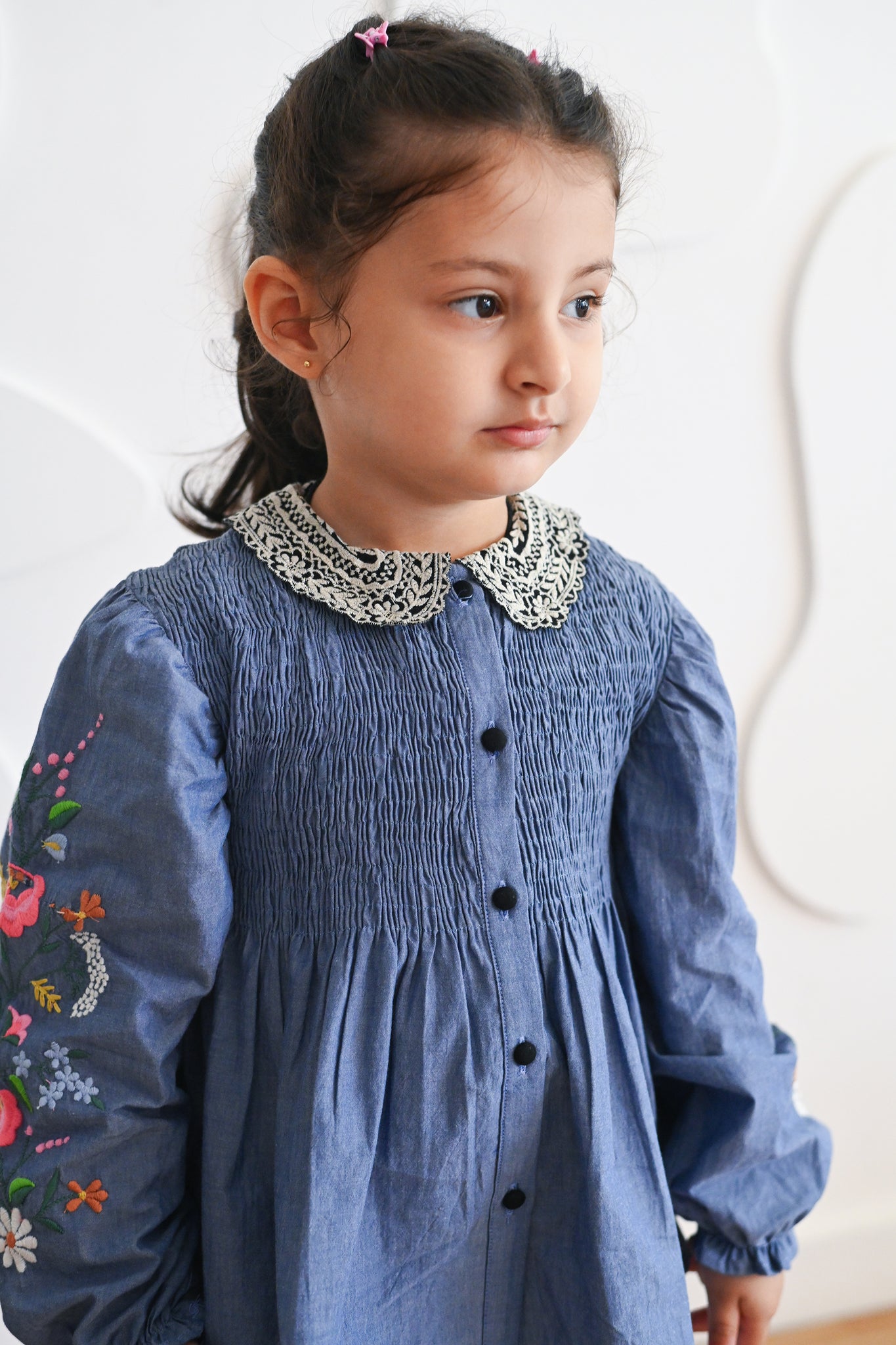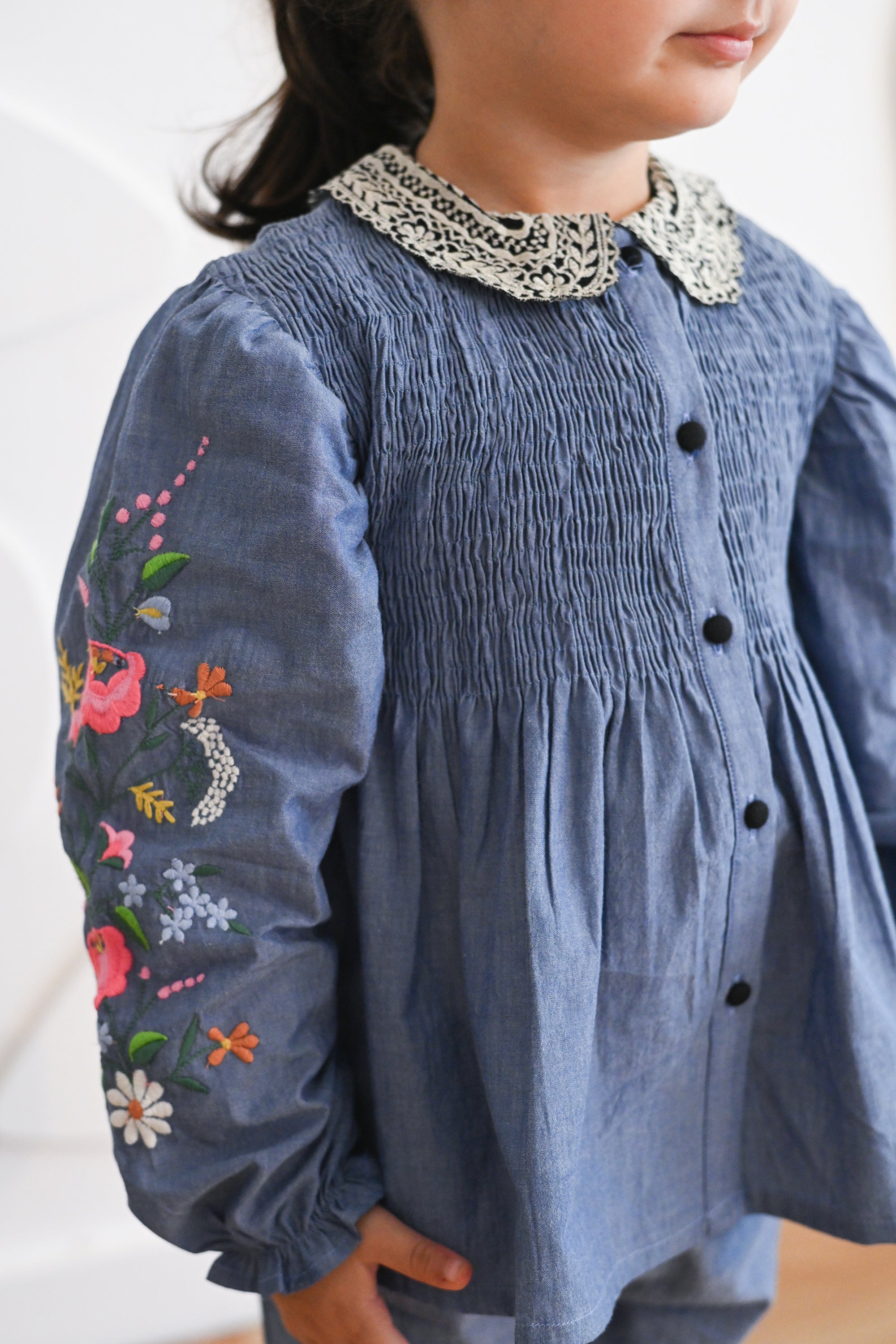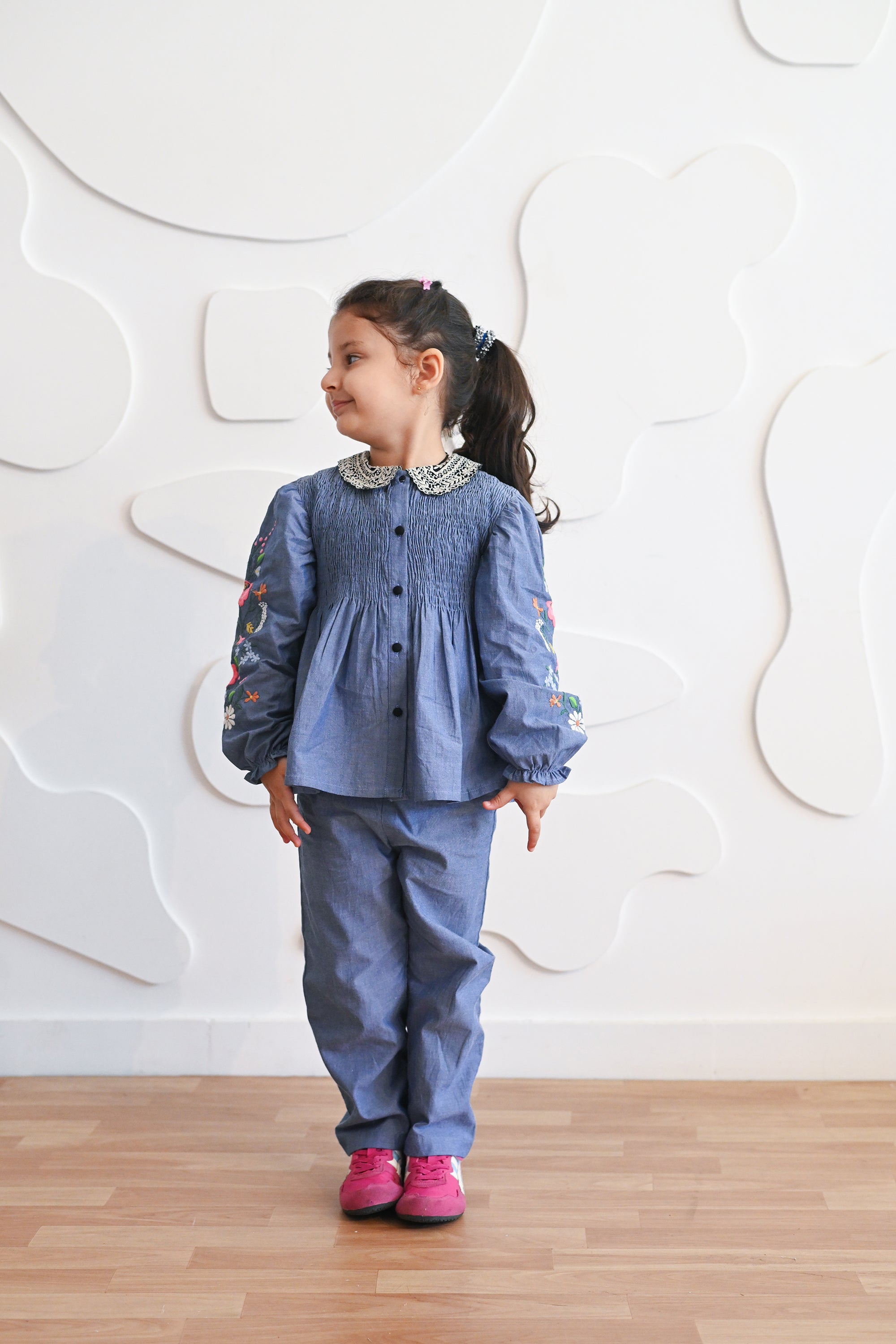 A coordinated set featuring a smocked bodice with delicate embroidered sleeves and a collar. The relaxed trousers complement the top, offering ease and charm in equal measure.