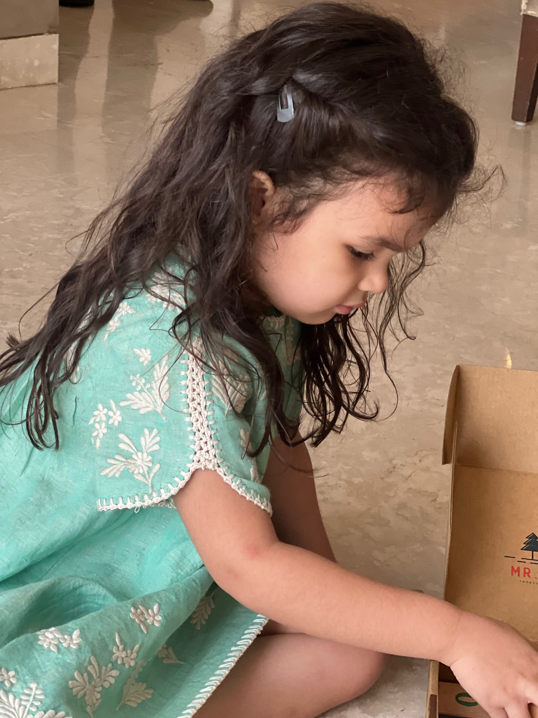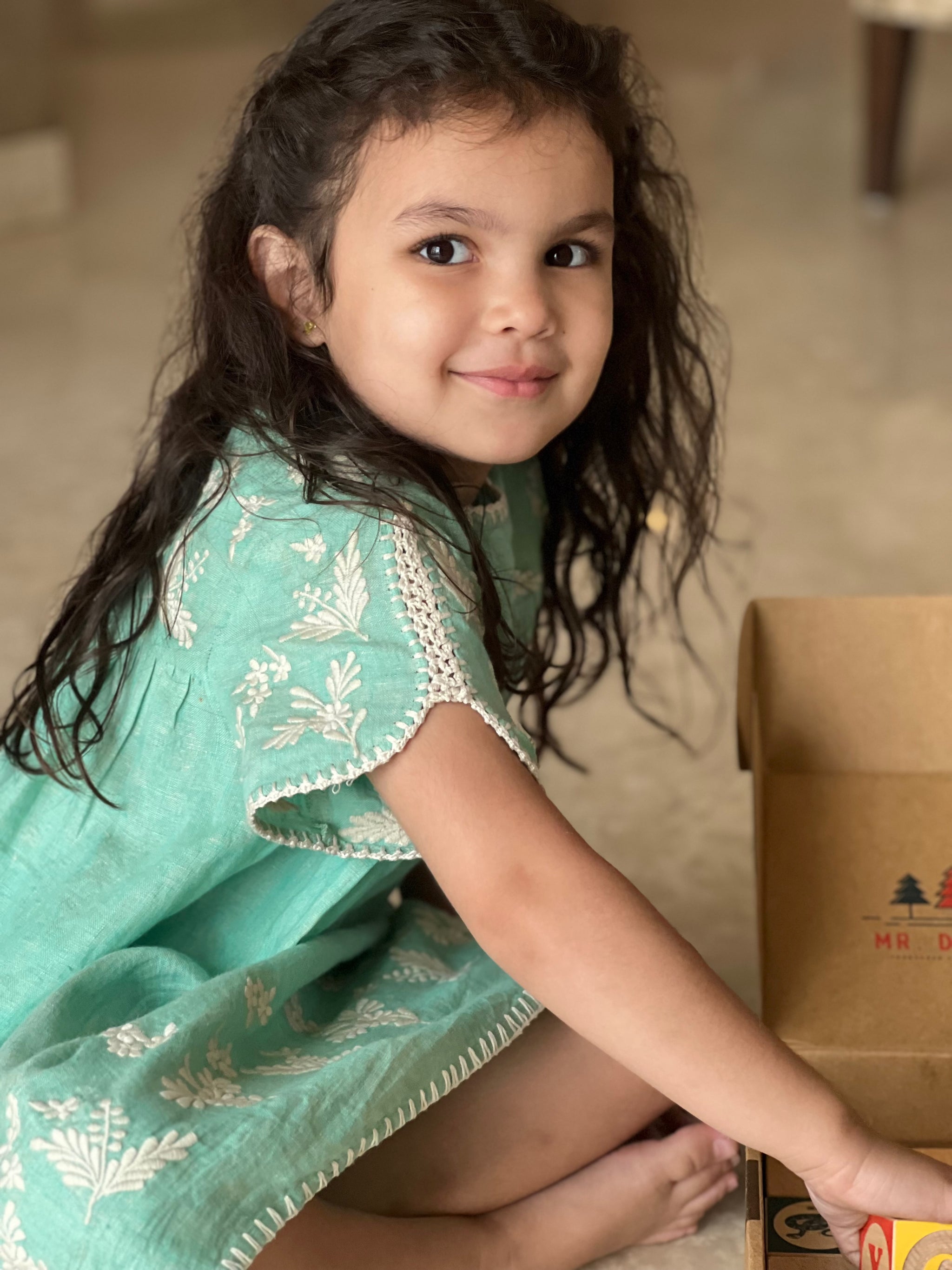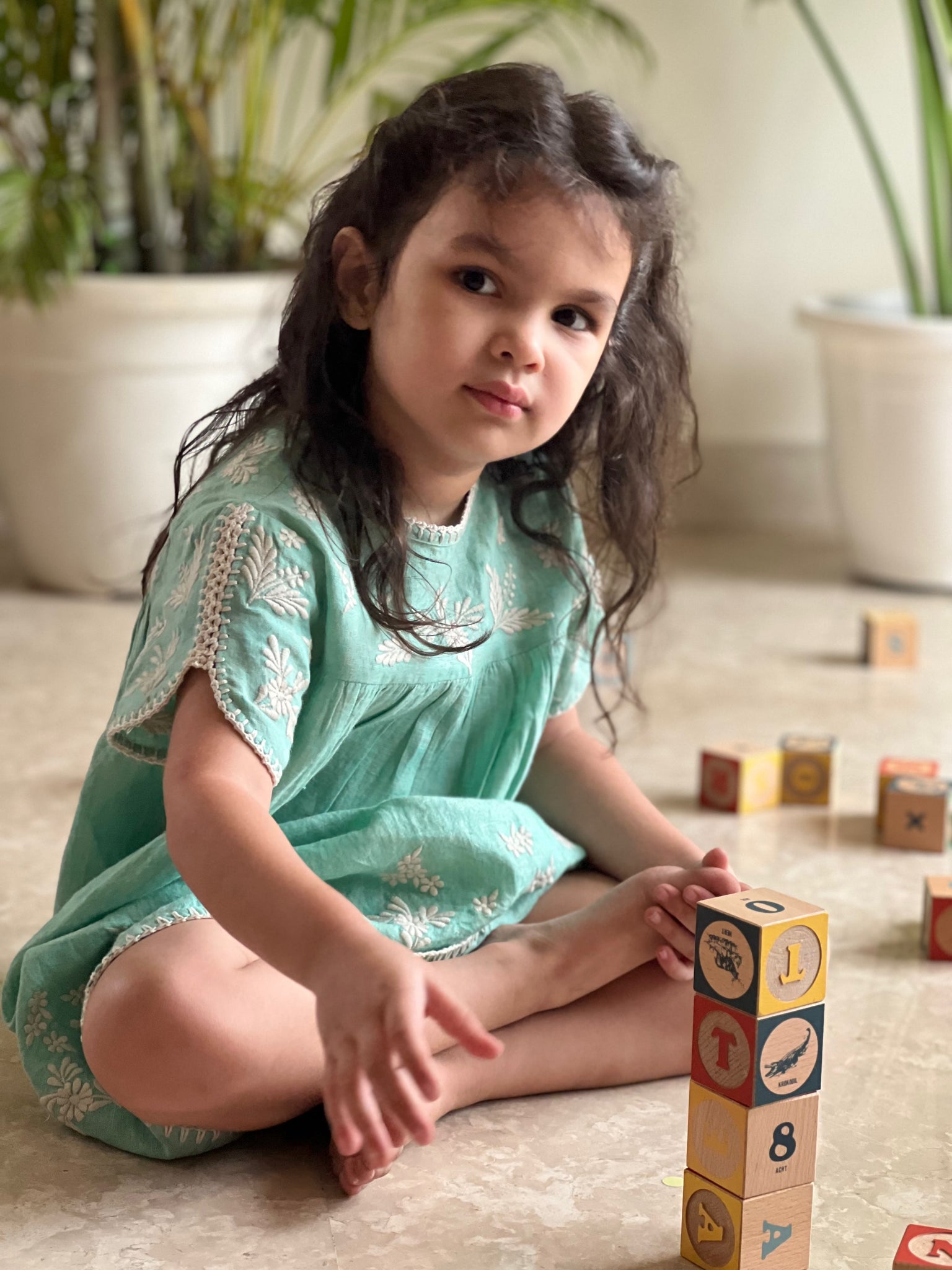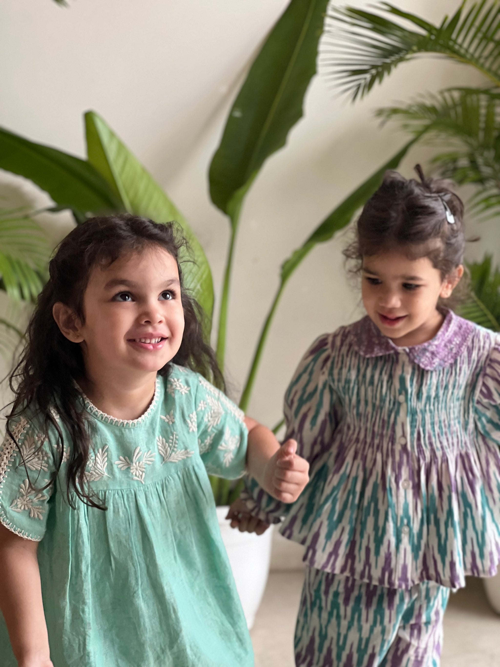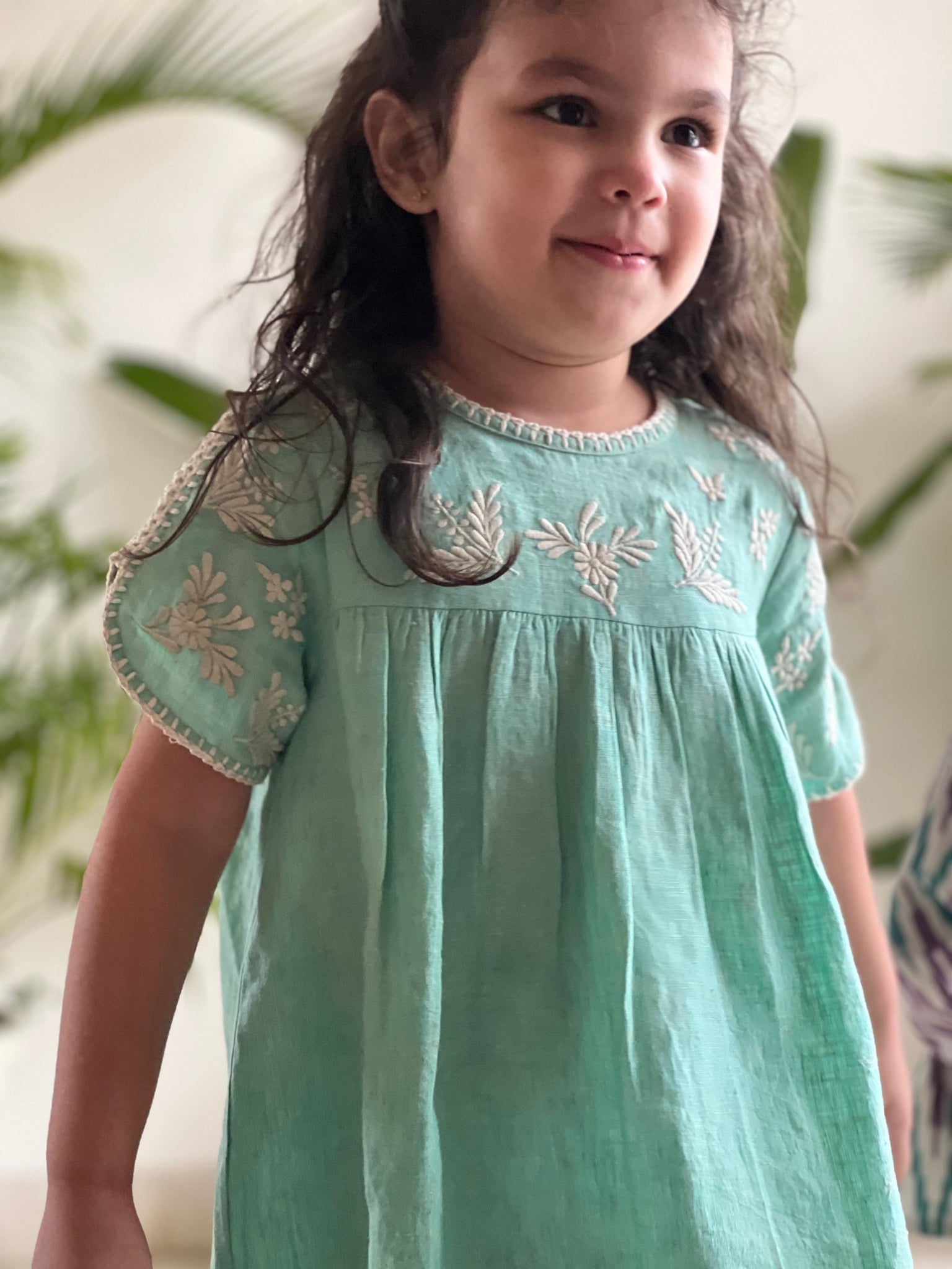 A fresh aqua dress designed with delicate pintuck detailing and a softly gathered silhouette for effortless comfort. Crafted in a lightweight, breathable fabric, this easy-wear style allows free movement while keeping little ones cool through warm days. Simple, elegant, and versatile, it’s perfect for everyday outings, playdates, and summer celebrations.