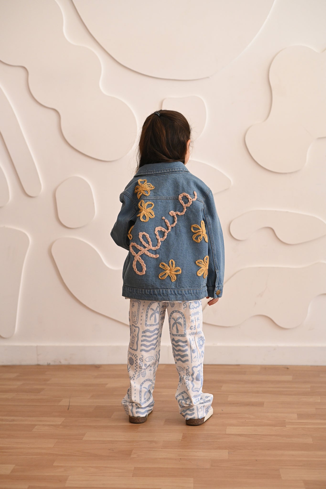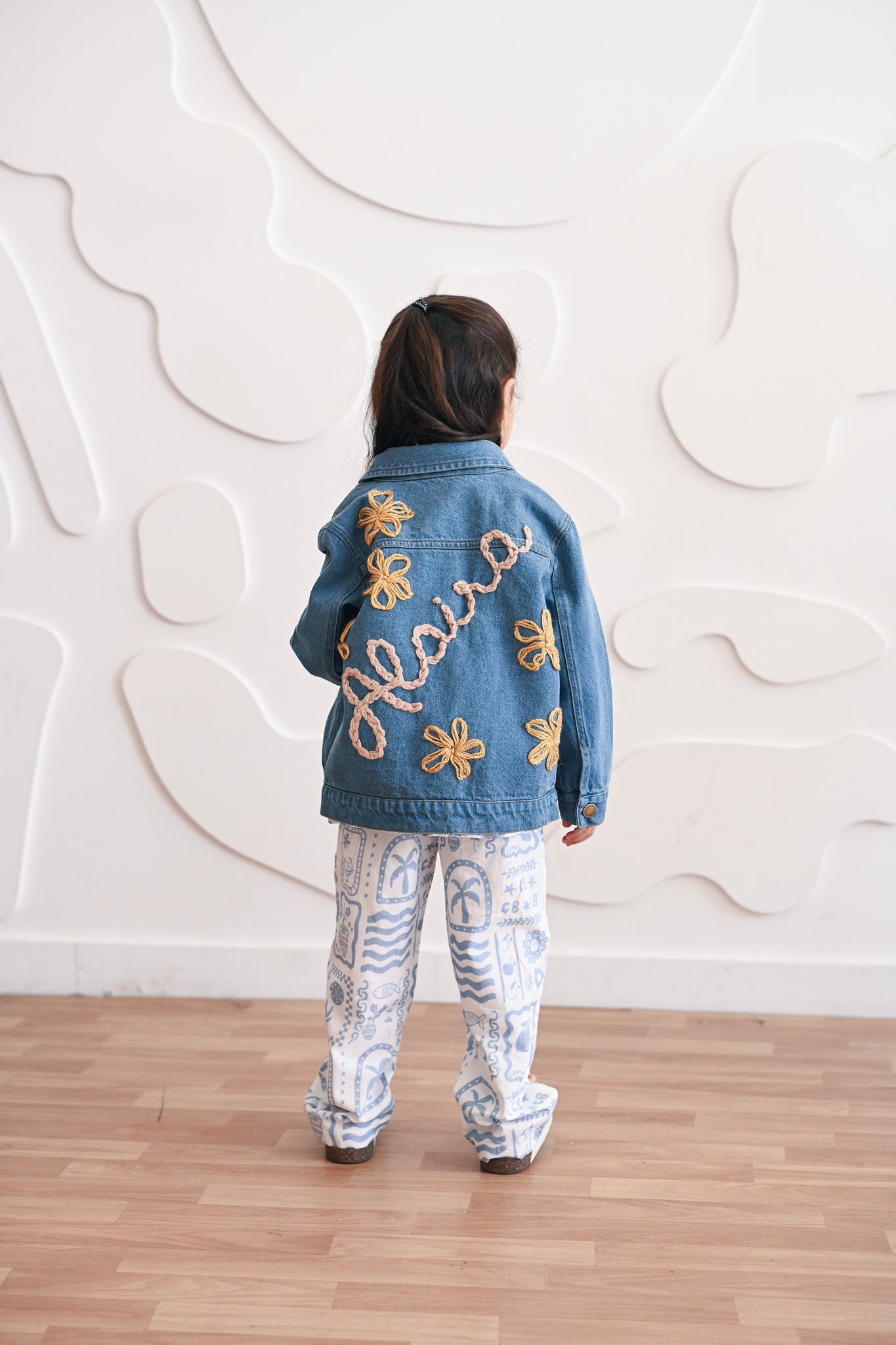 A denim jacket designed for ease and individuality. This piece features a relaxed trucker fit with a lapel collar, front button closures, and matching front pockets. Custom white pearl embroidery elevates its classic structure, while the soft, lightweight finish ensures comfort for everyday wear. 100% cotton Relaxed, loose fit Lapel collar and buttoned front Custom white pearl embroidery Note: Hand wash recommended. The fabric may fade with wear and washing.