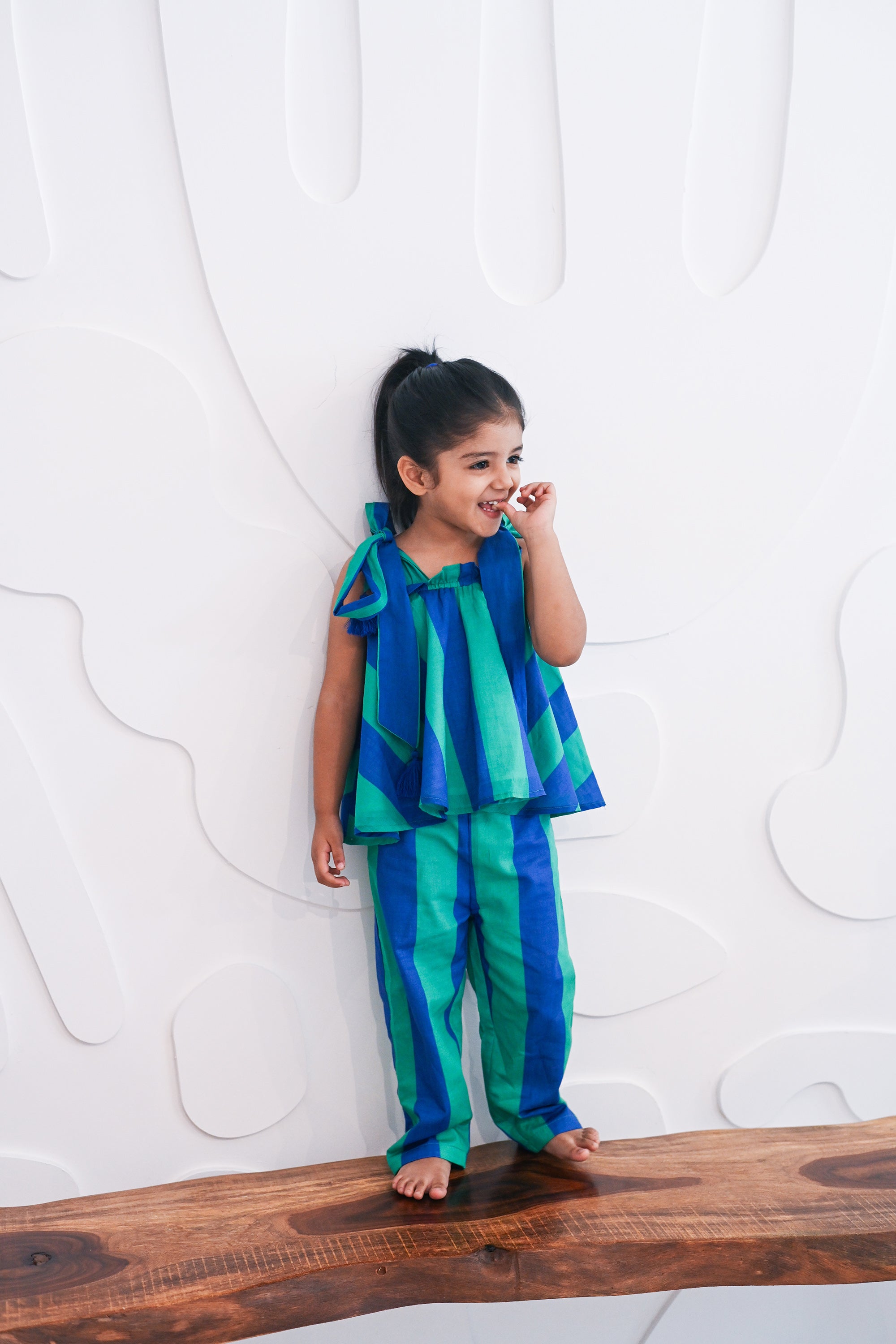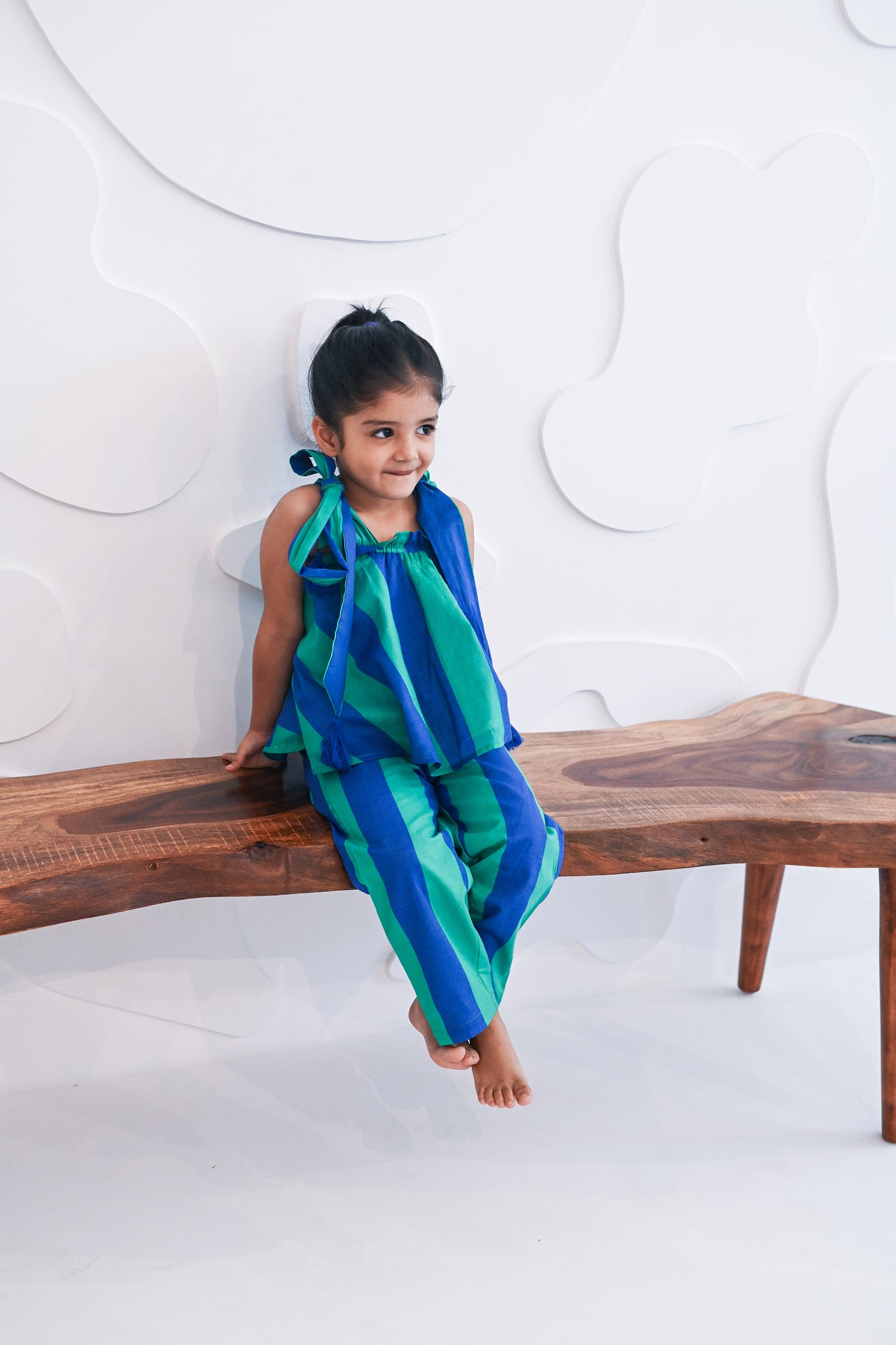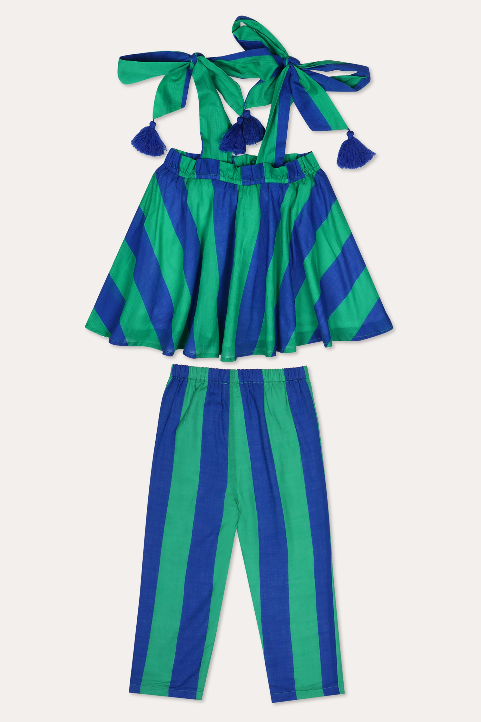 A set with green and blue stripes, complete with adjustable tie straps with tassles for added detail. The flowing silhouette offers a breathable, relaxed fit.
