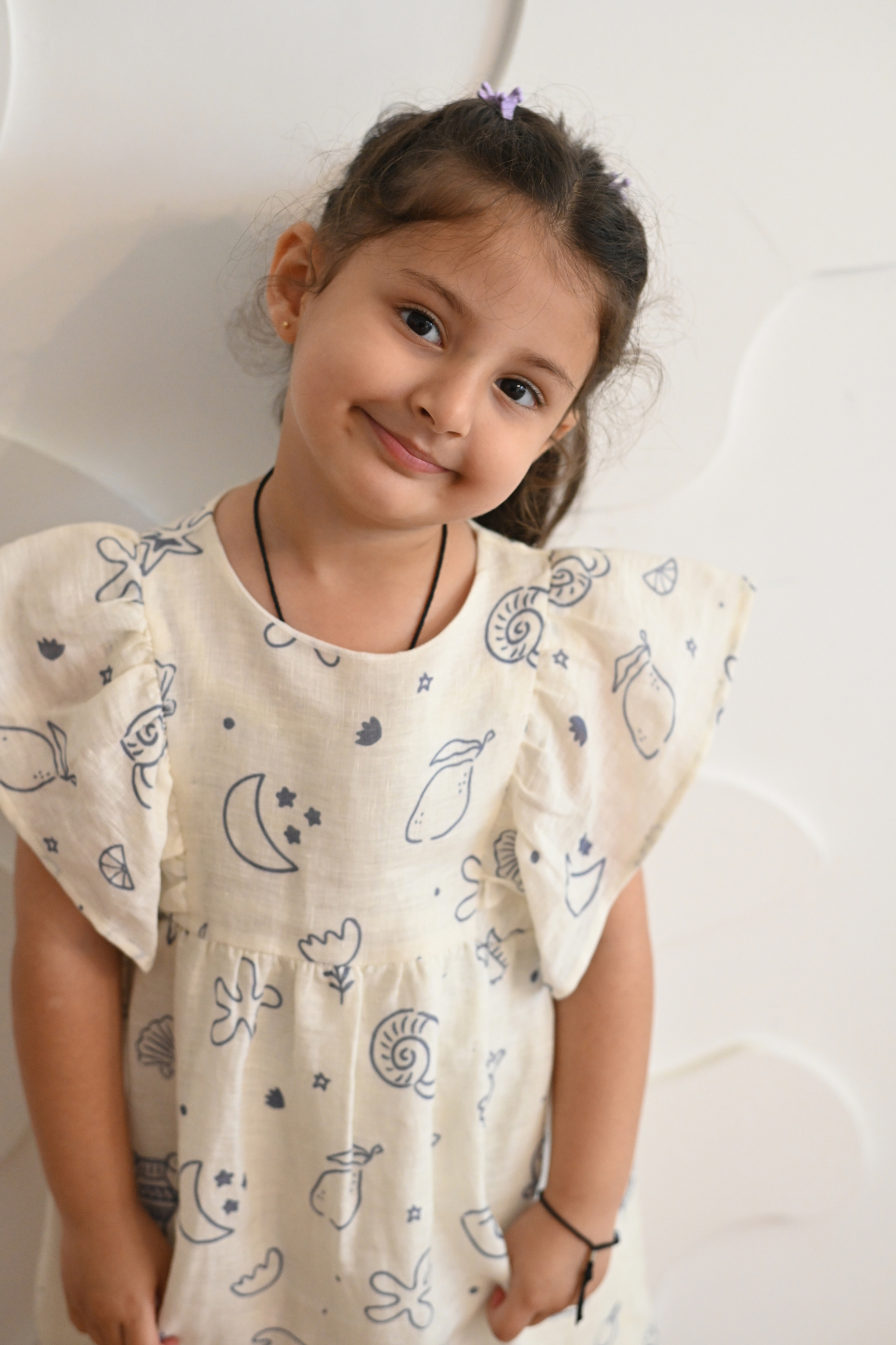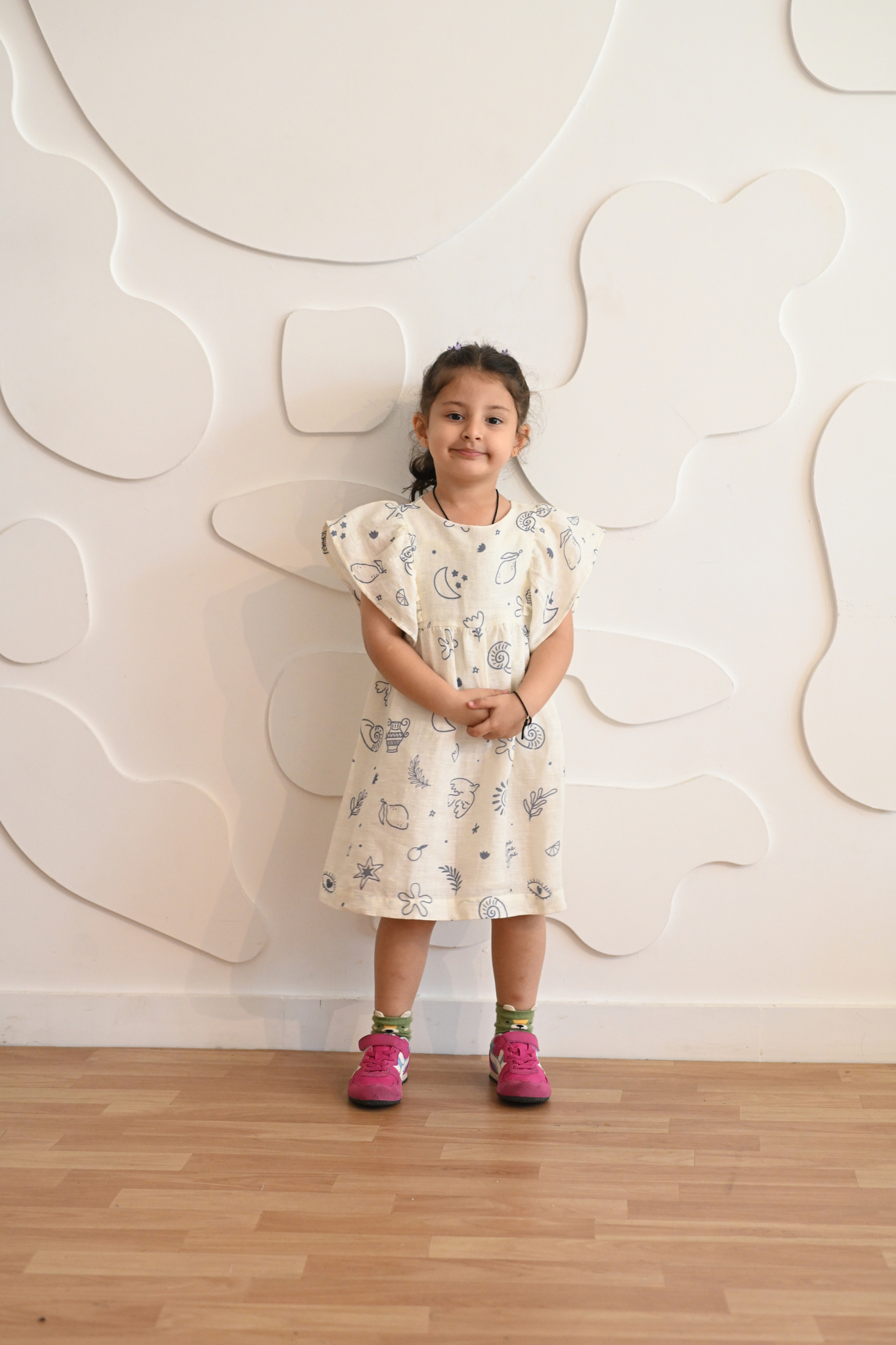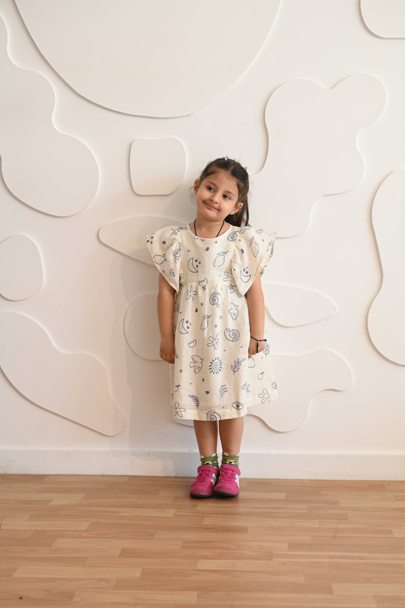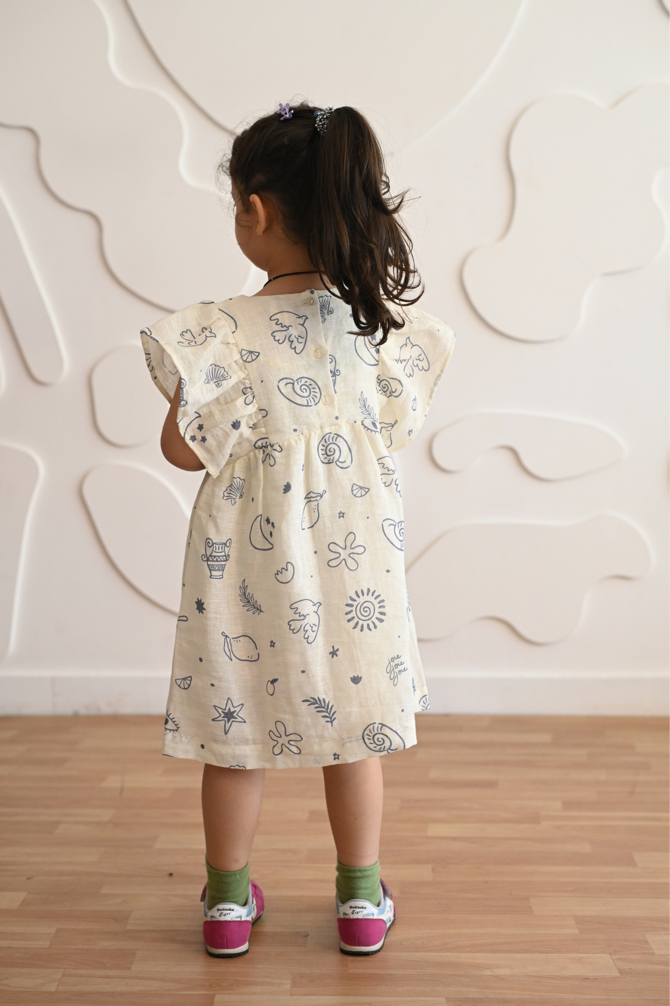 A breezy linen dress with hand-illustrated blue motifs. The playful flutter-style details on the shoulders and relaxed gathers add a whimsical touch.