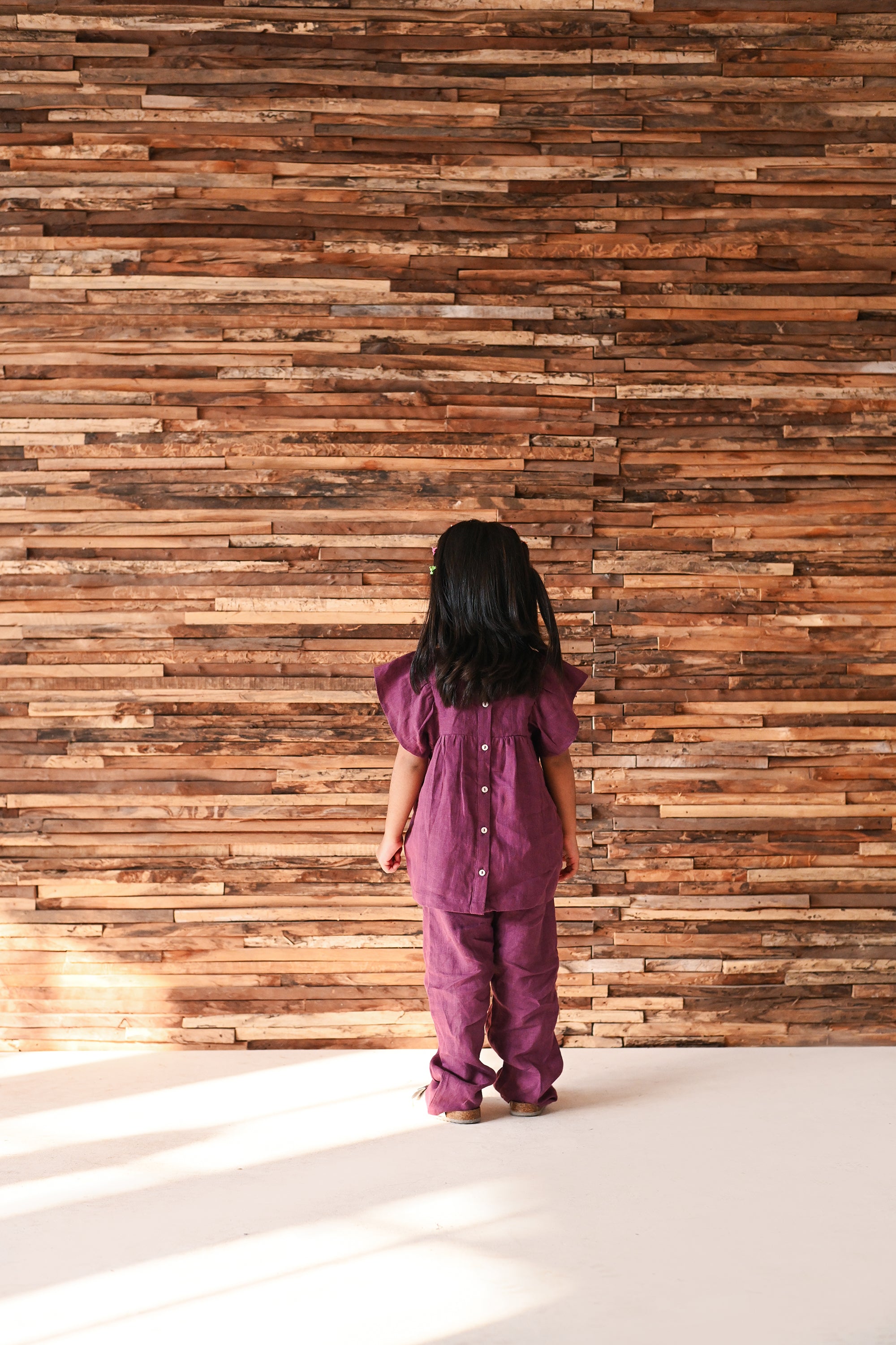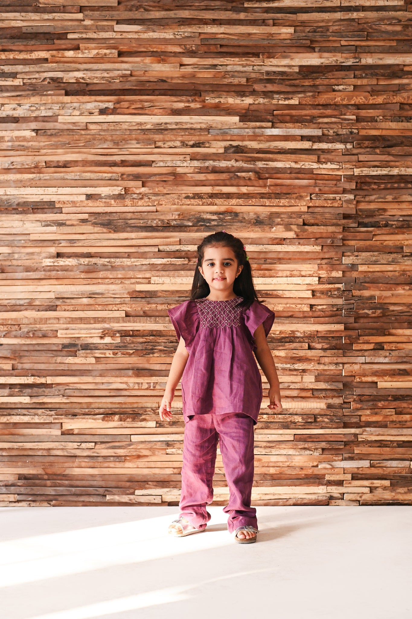 A coordinated set featuring a handsmocked bodice with delicate flutter sleeves. The relaxed trousers complement the top, offering ease and charm in equal measure.