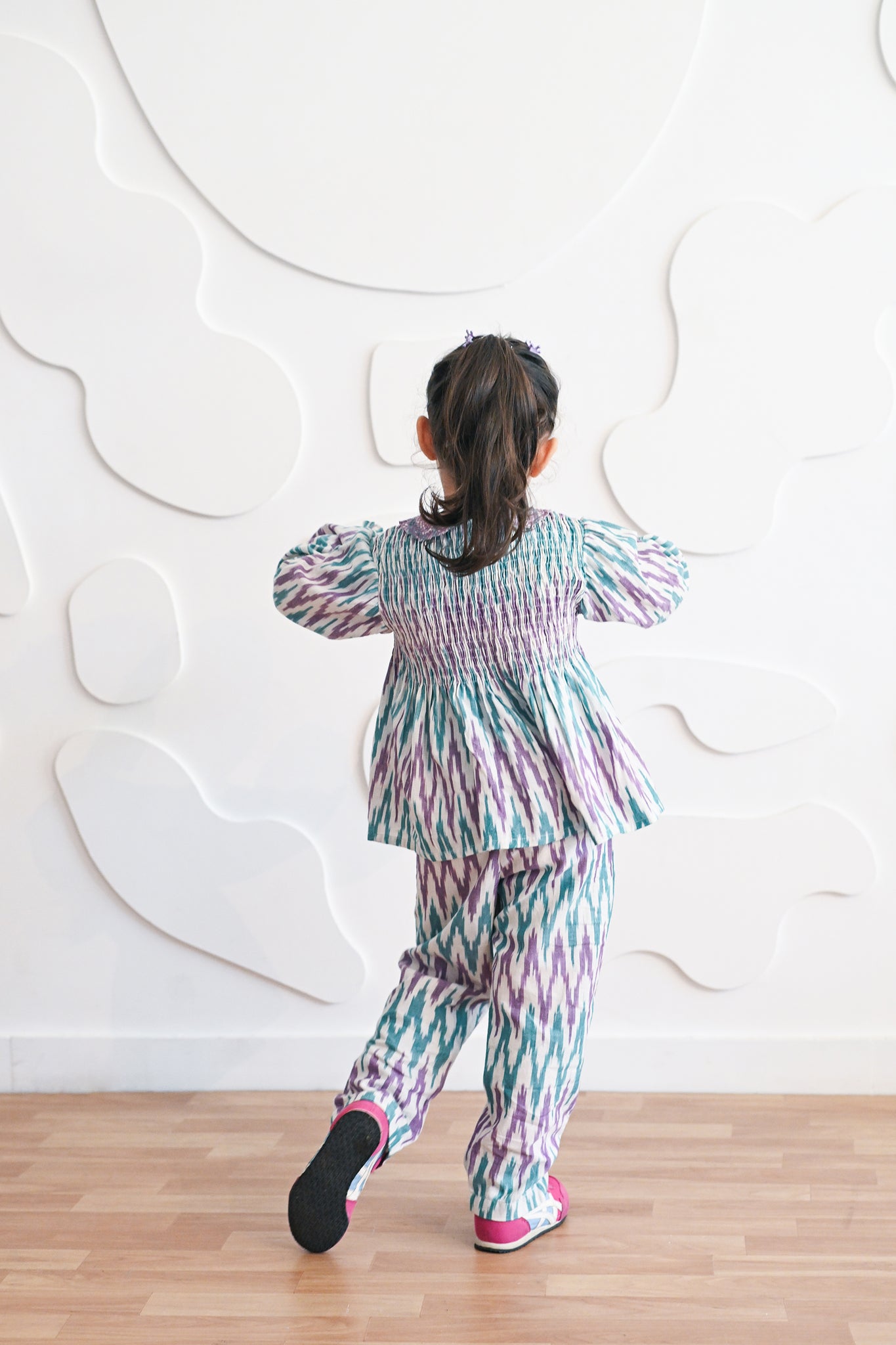 A coordinated set featuring a smocked bodice with delicate embroidered collar. The relaxed trousers complement the top, offering ease and charm in equal measure.