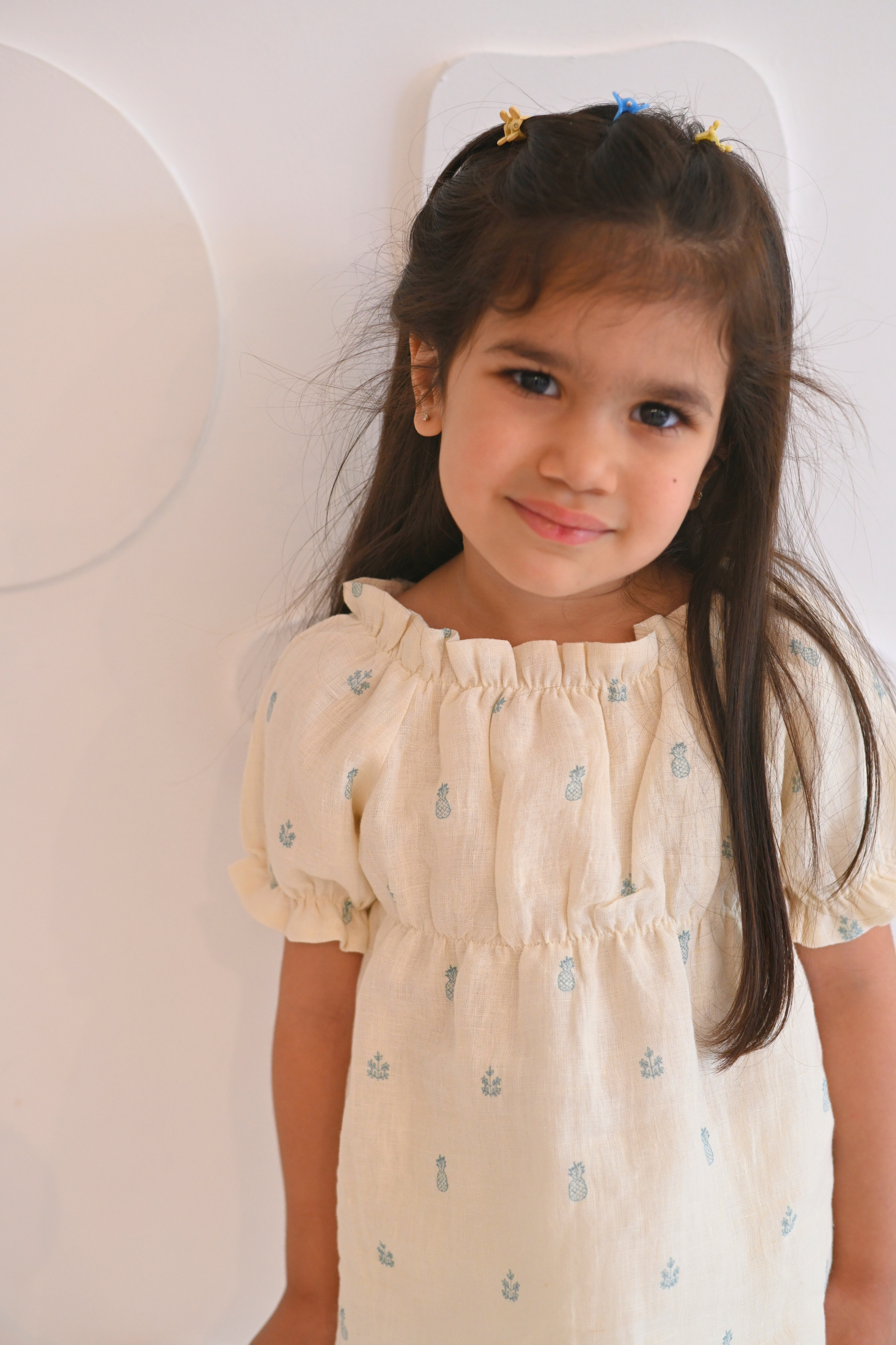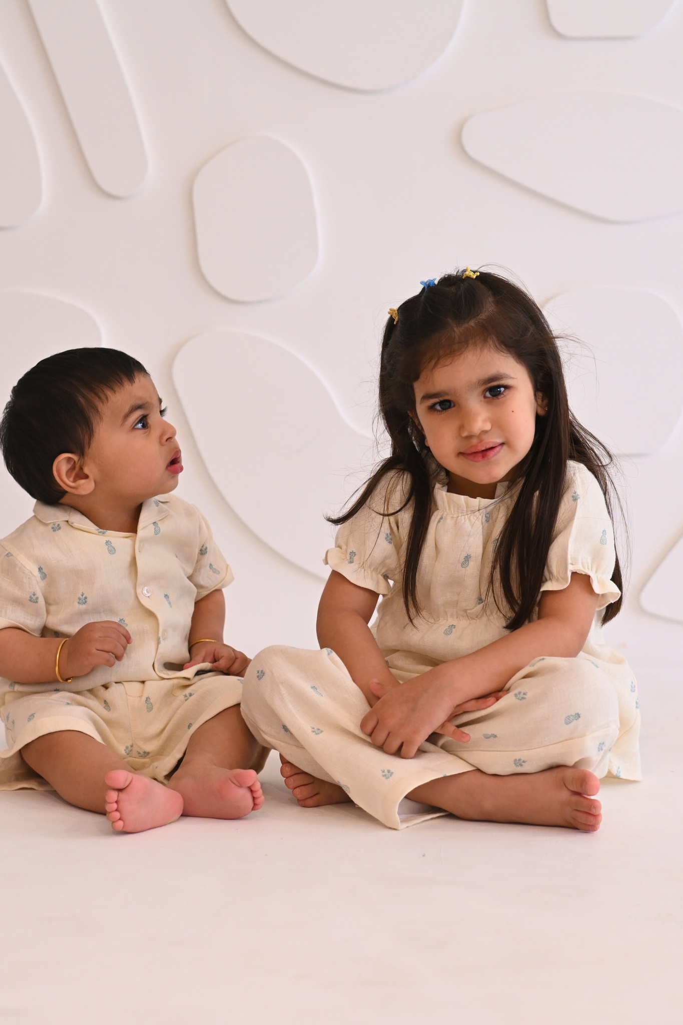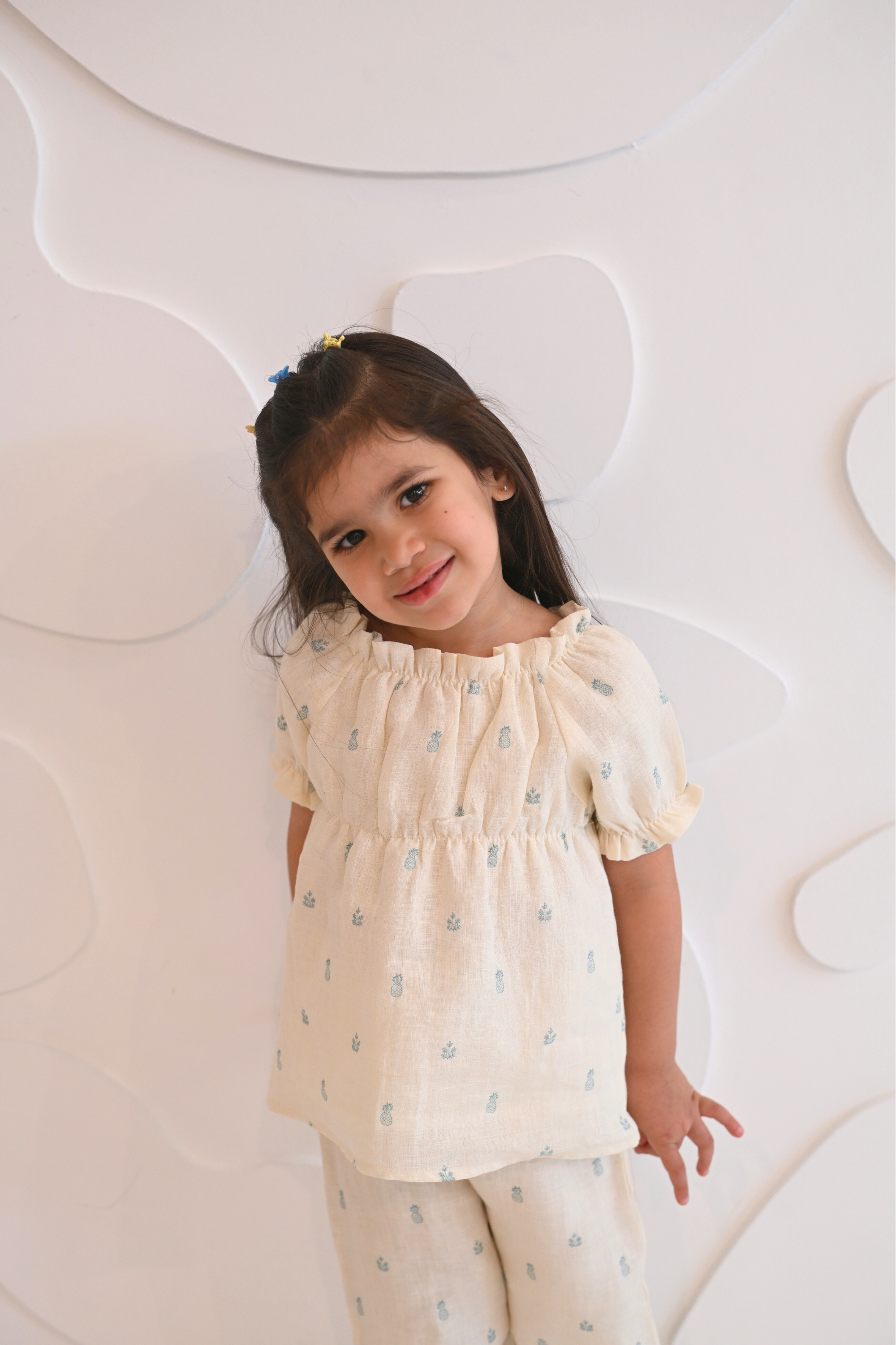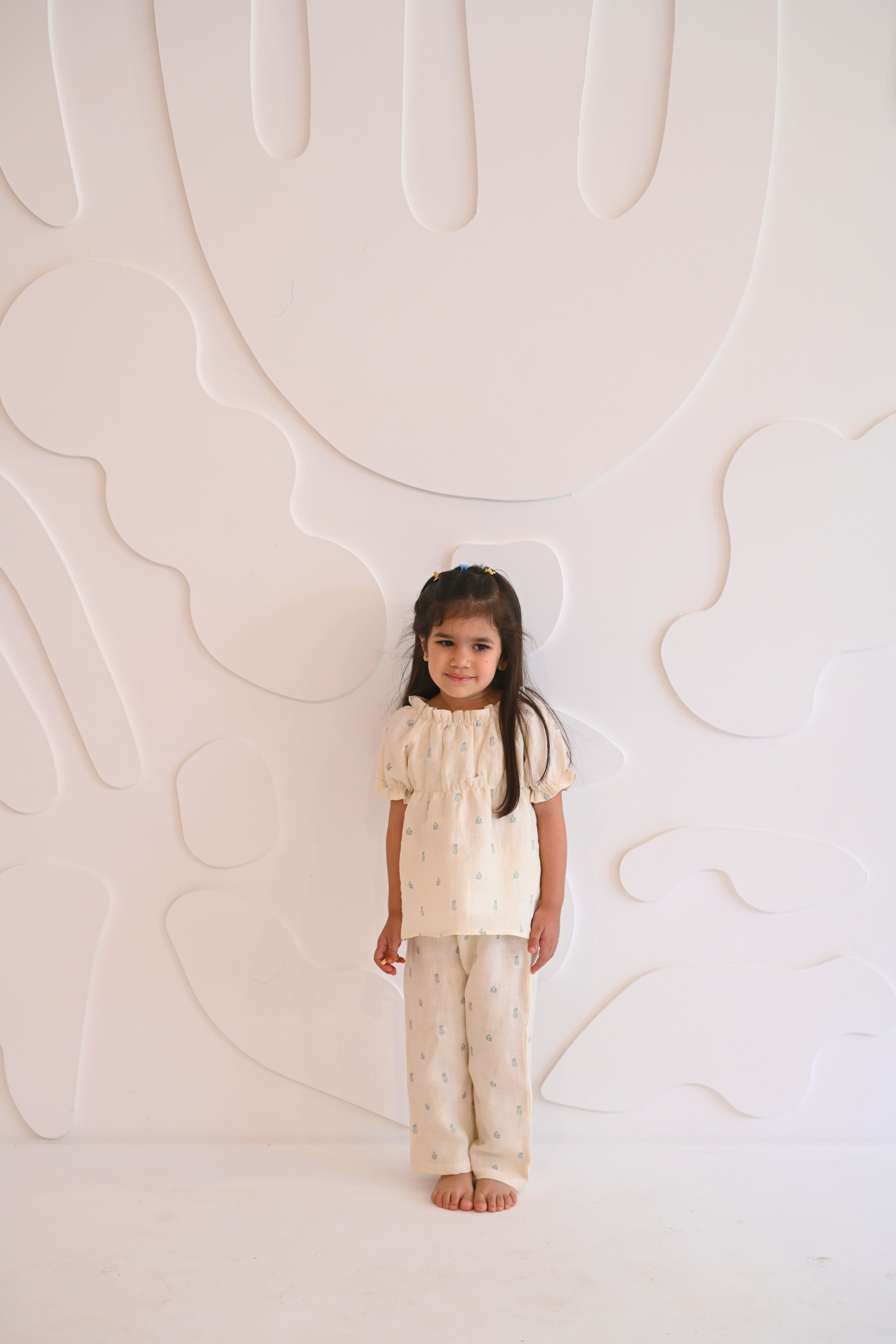 A two-piece set featuring a softly gathered top with an elasticated neckline. The top falls gently with a loose, airy shape. Paired with straight-cut bottoms designed with a comfortable waist and a clean, unfussy finish, allowing ease of movement while keeping the silhouette balanced.